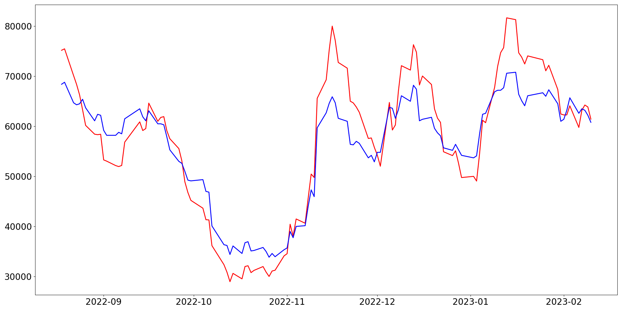 [ - : 실제값(종가) / - : 예측값(종가) ]