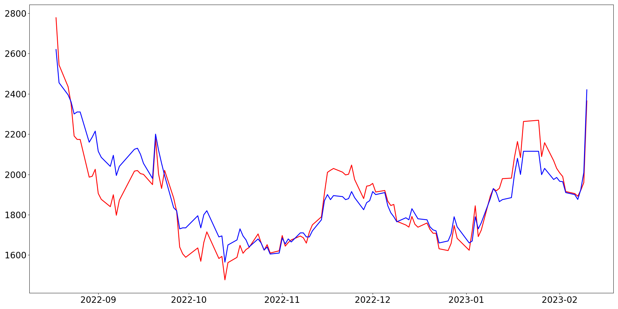 [ - : 실제값(종가) / - : 예측값(종가) ]