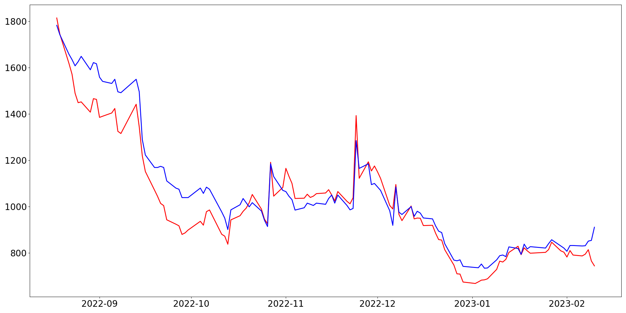 [ - : 실제값(종가) / - : 예측값(종가) ]