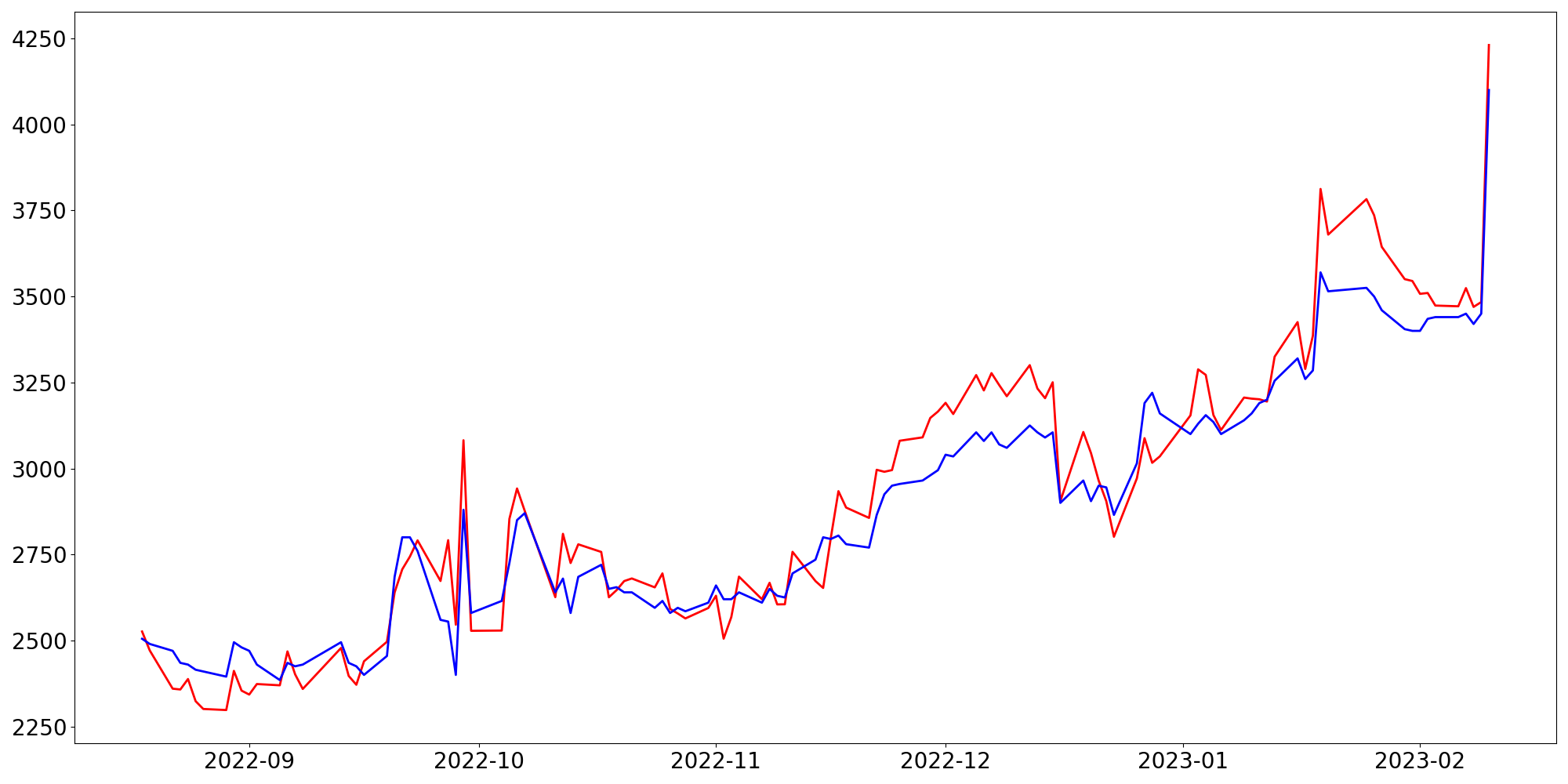 [ - : 실제값(종가) / - : 예측값(종가) ]