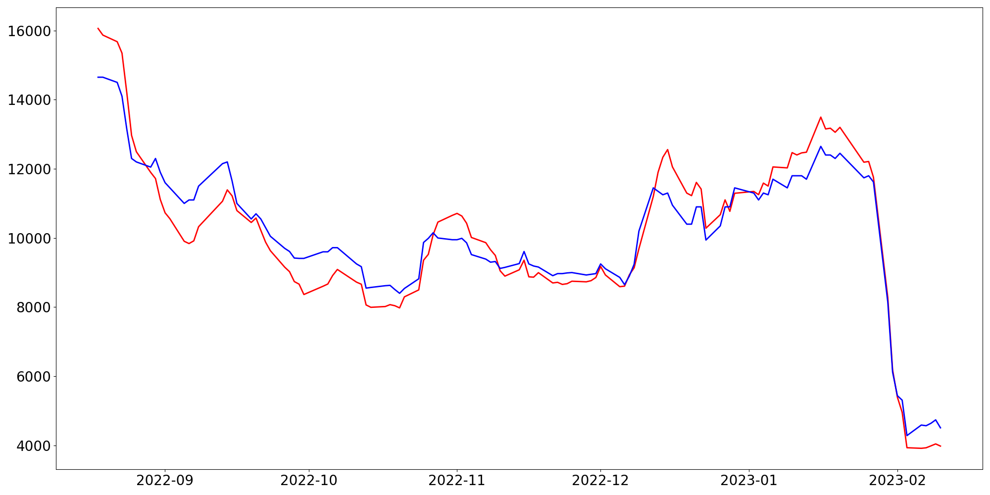 [ - : 실제값(종가) / - : 예측값(종가) ]