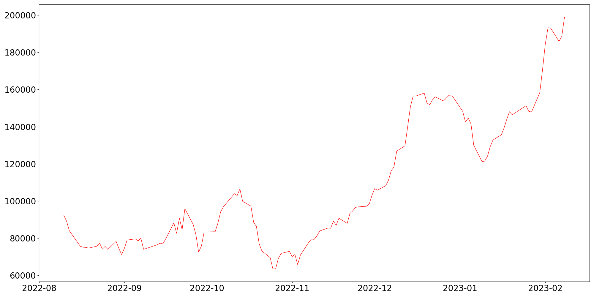 [ - : 실제값(종가) / - : 예측값(종가) ]