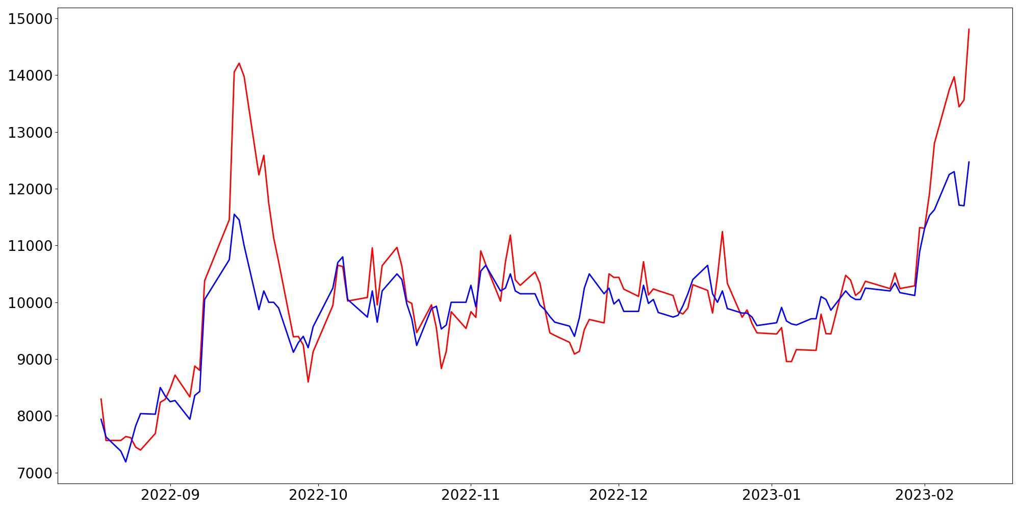 [ - : 실제값(종가) / - : 예측값(종가) ]