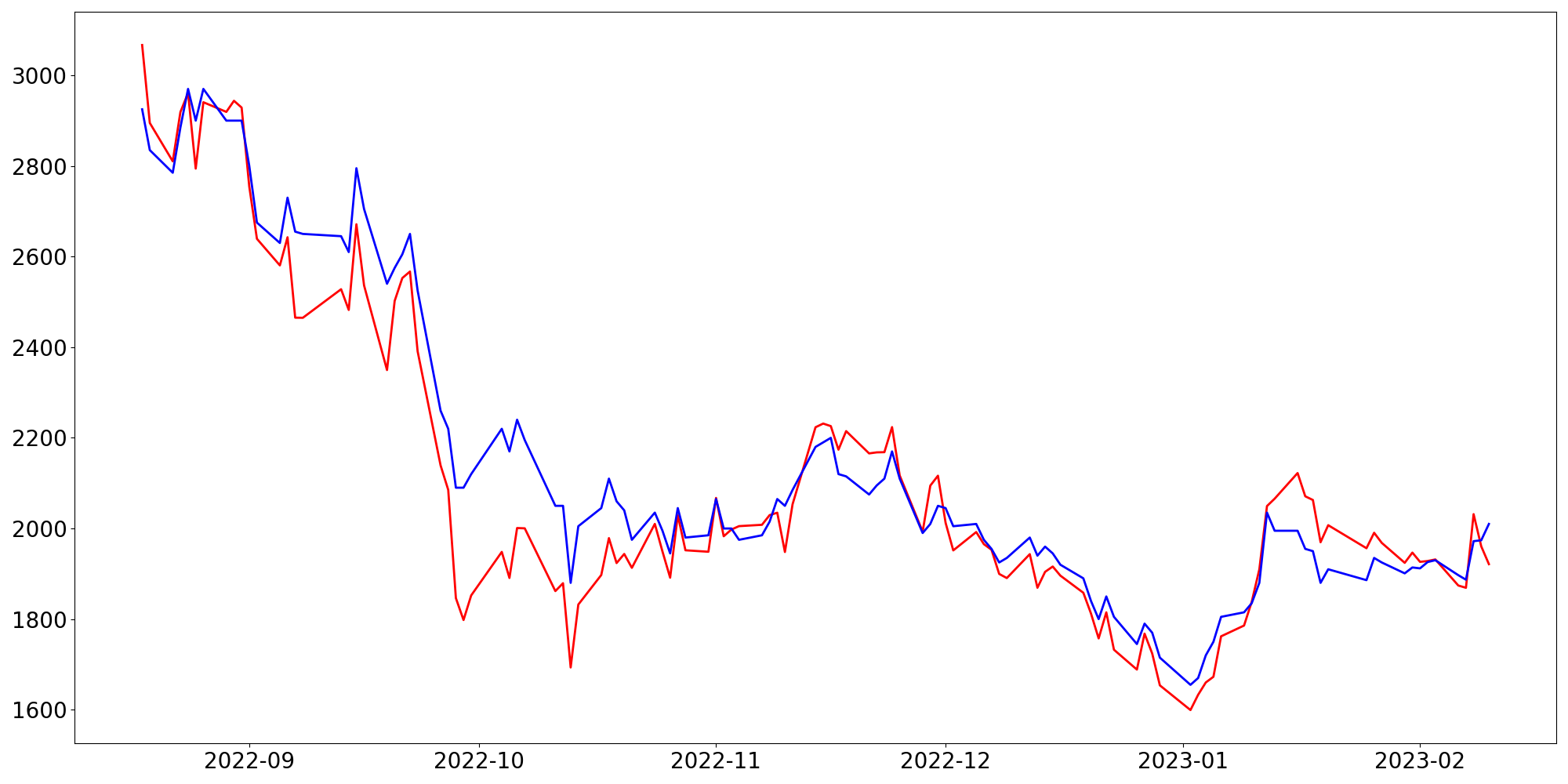 [ - : 실제값(종가) / - : 예측값(종가) ]