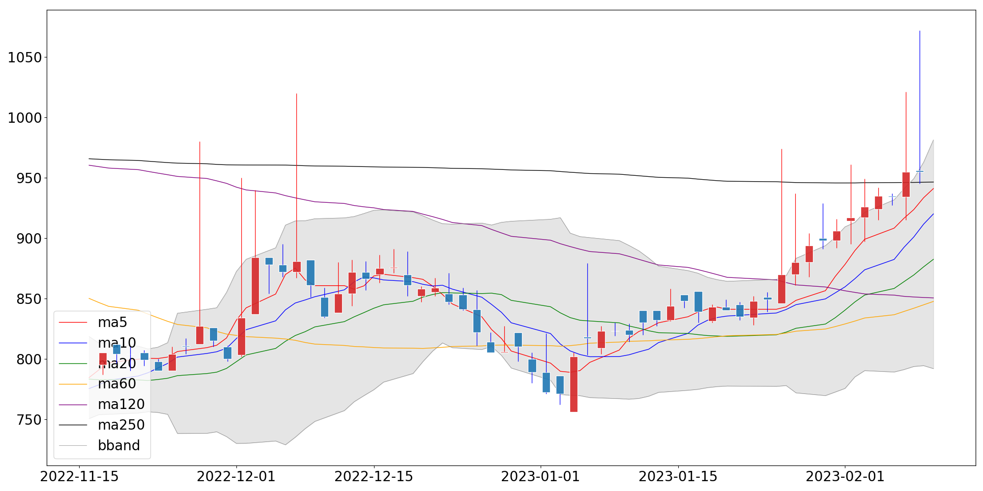 □ 중기 : 현재 종가가 중기(60일) 이동평균값(848원)을 상회 하여 중기적 추세 상승 중