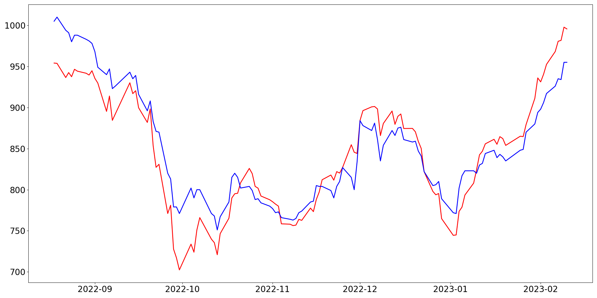 [ - : 실제값(종가) / - : 예측값(종가) ]