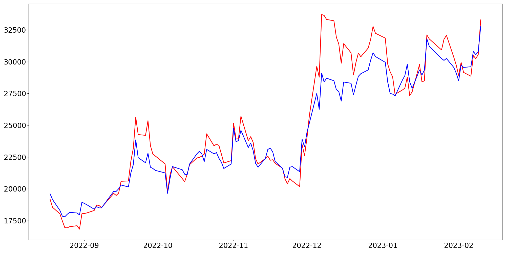 [ - : 실제값(종가) / - : 예측값(종가) ]