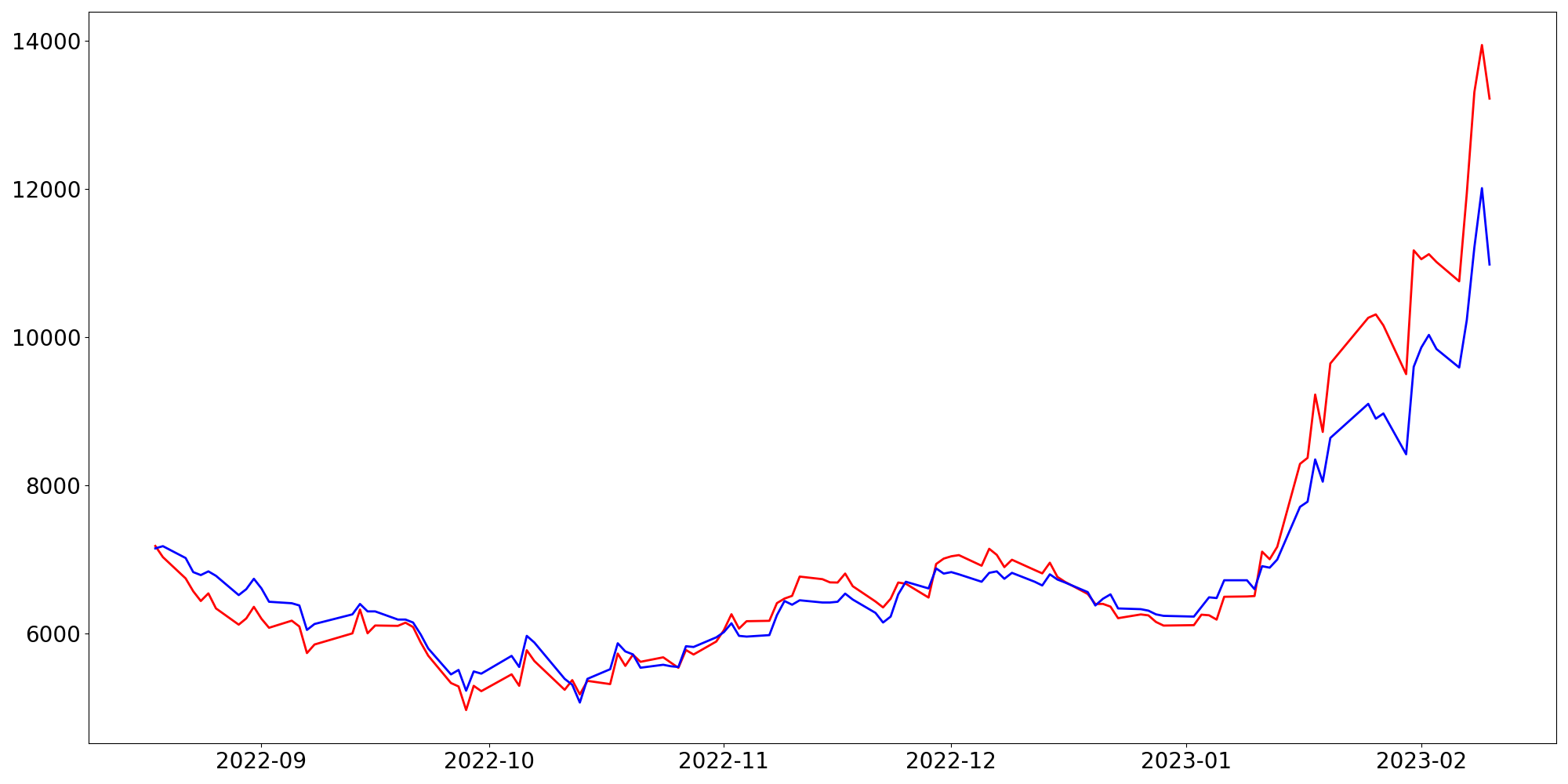 [ - : 실제값(종가) / - : 예측값(종가) ]