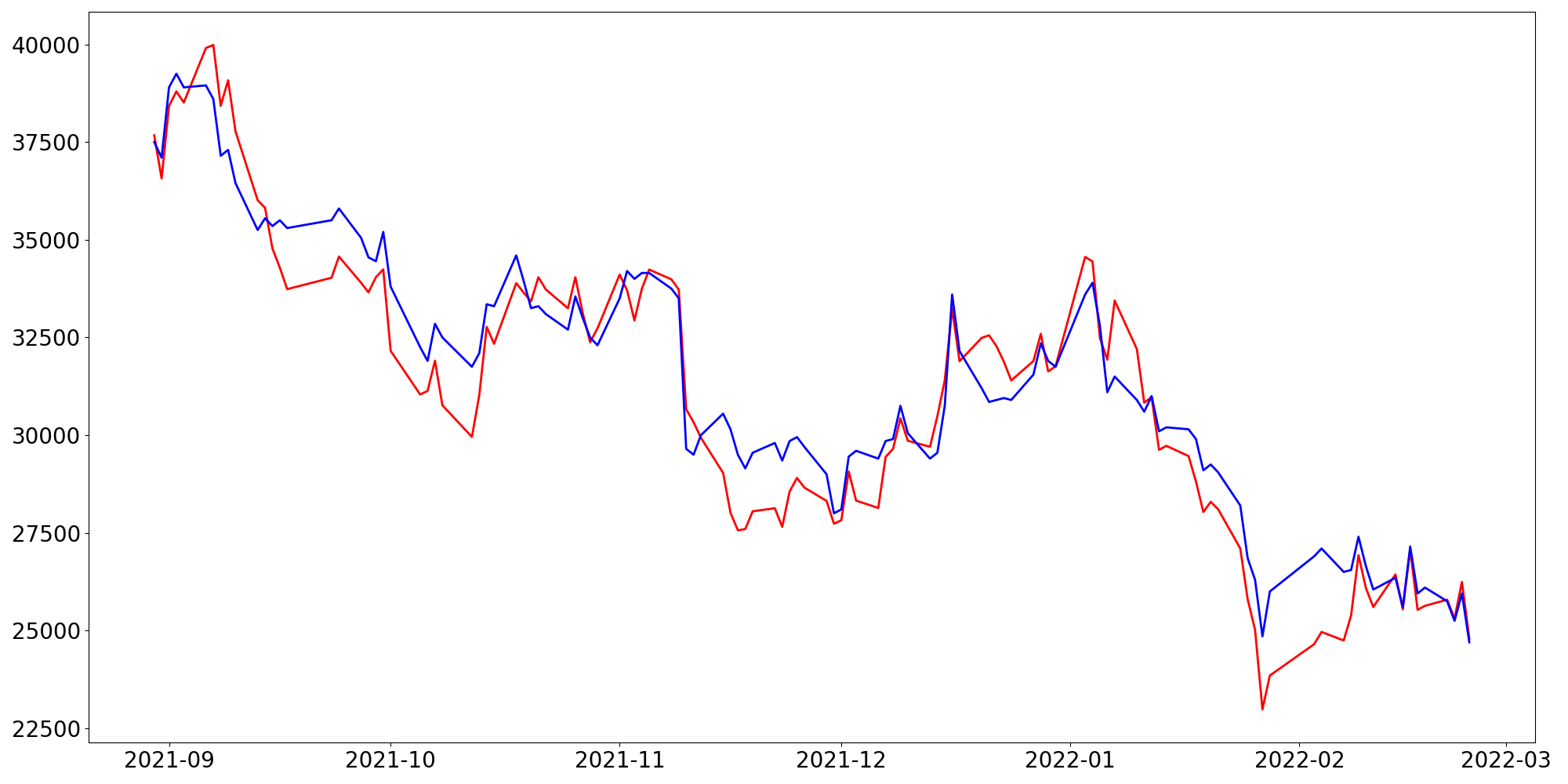 [ - : 실제값(종가) / - : 예측값(종가) ]