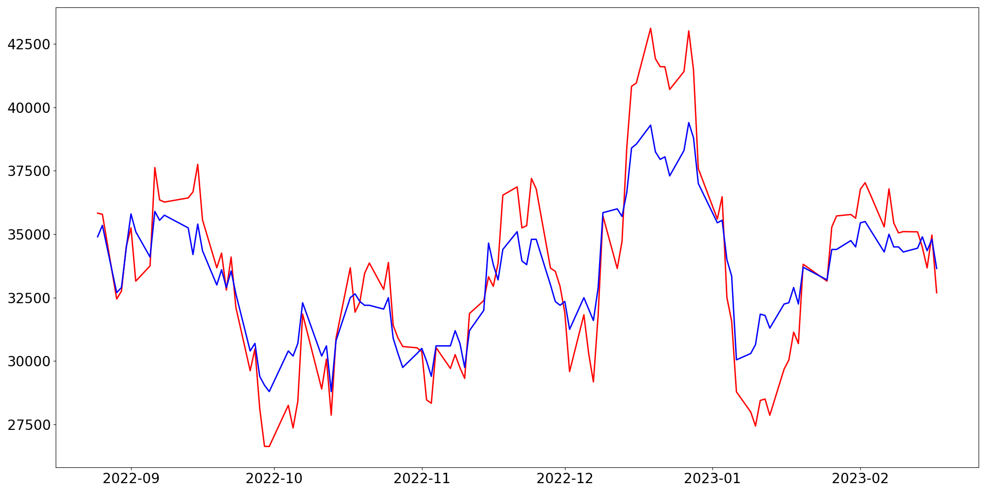 [ - : 실제값(종가) / - : 예측값(종가) ]