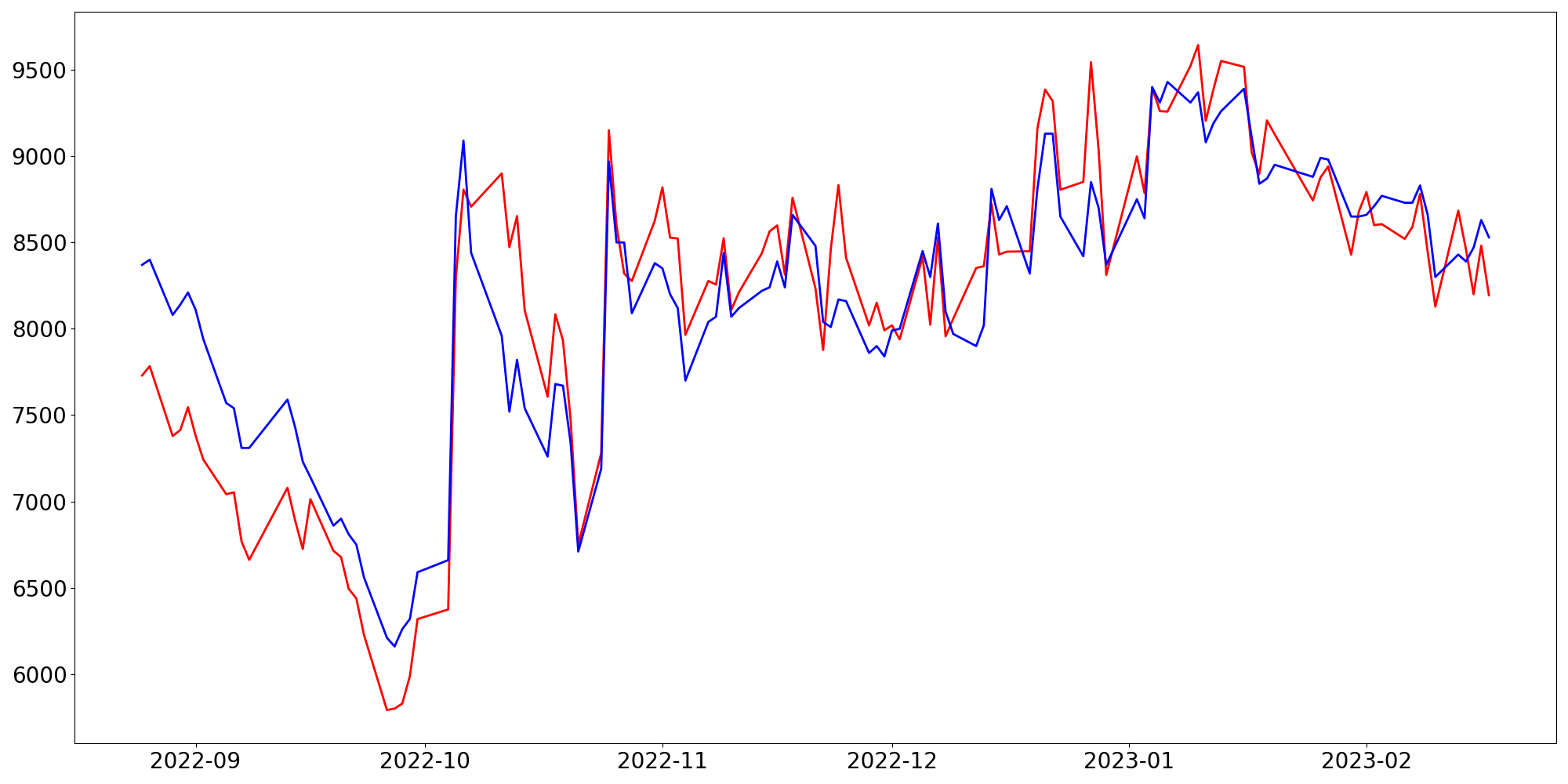 [ - : 실제값(종가) / - : 예측값(종가) ]