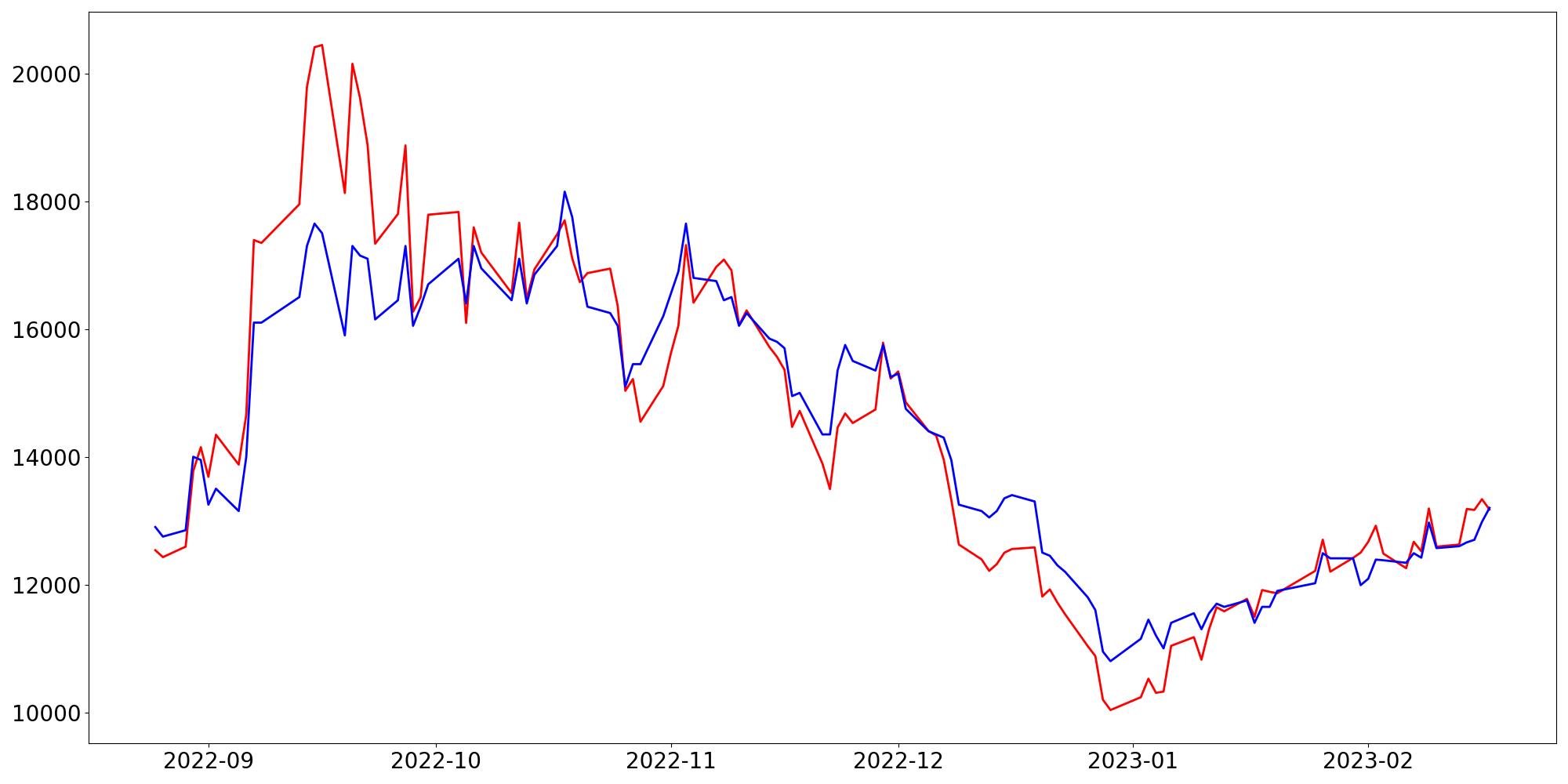 [ - : 실제값(종가) / - : 예측값(종가) ]