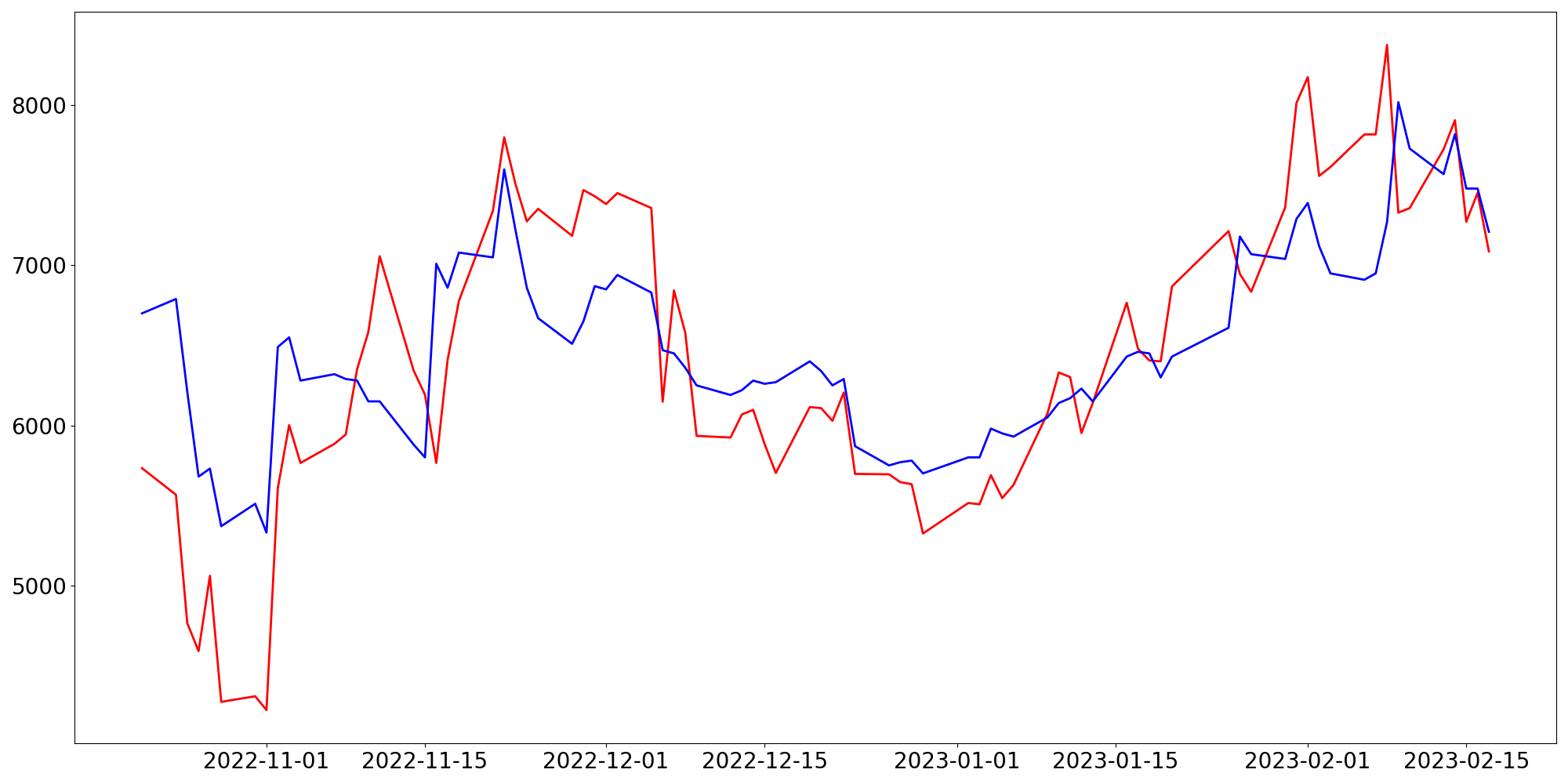 [ - : 실제값(종가) / - : 예측값(종가) ]