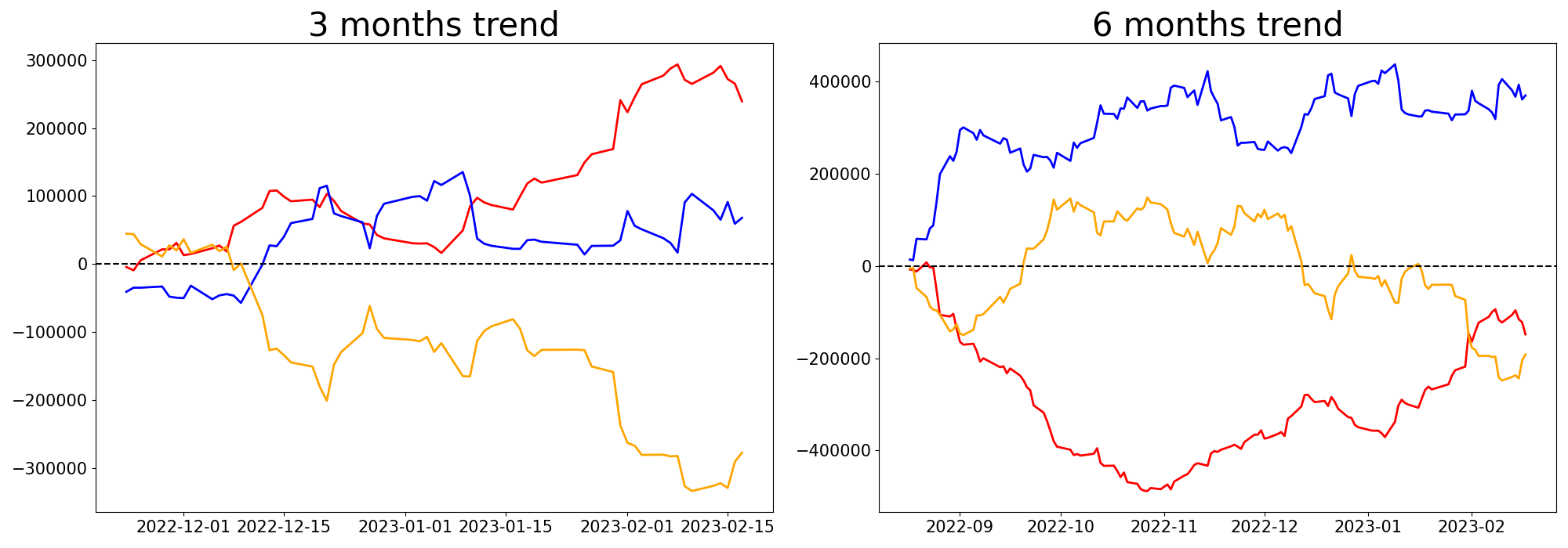 기관, 개인, 외국인으로 분류하여 투자주체별 일정기간동안의 누적적 매수/매도 현황을 분석한 내용입니다. 특정일의 투자자별 매매동향을 통해서 단기간의 시장충격여부를 판단할 수 있으며 장기적인 매매동향을 통해서 해당 종목의 장기 모멘텀을 판단해 볼 수 있습니다.
