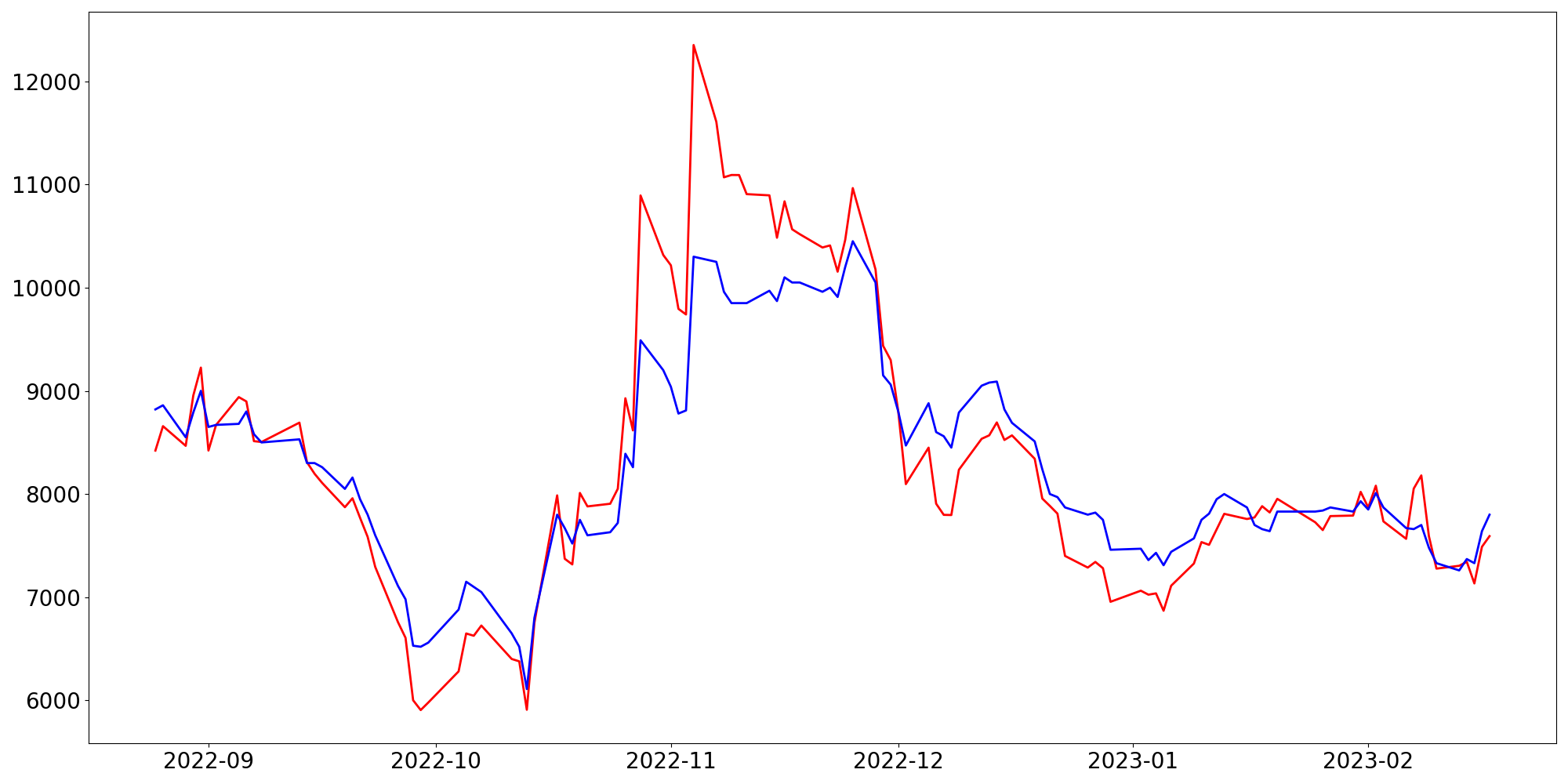 [ - : 실제값(종가) / - : 예측값(종가) ]