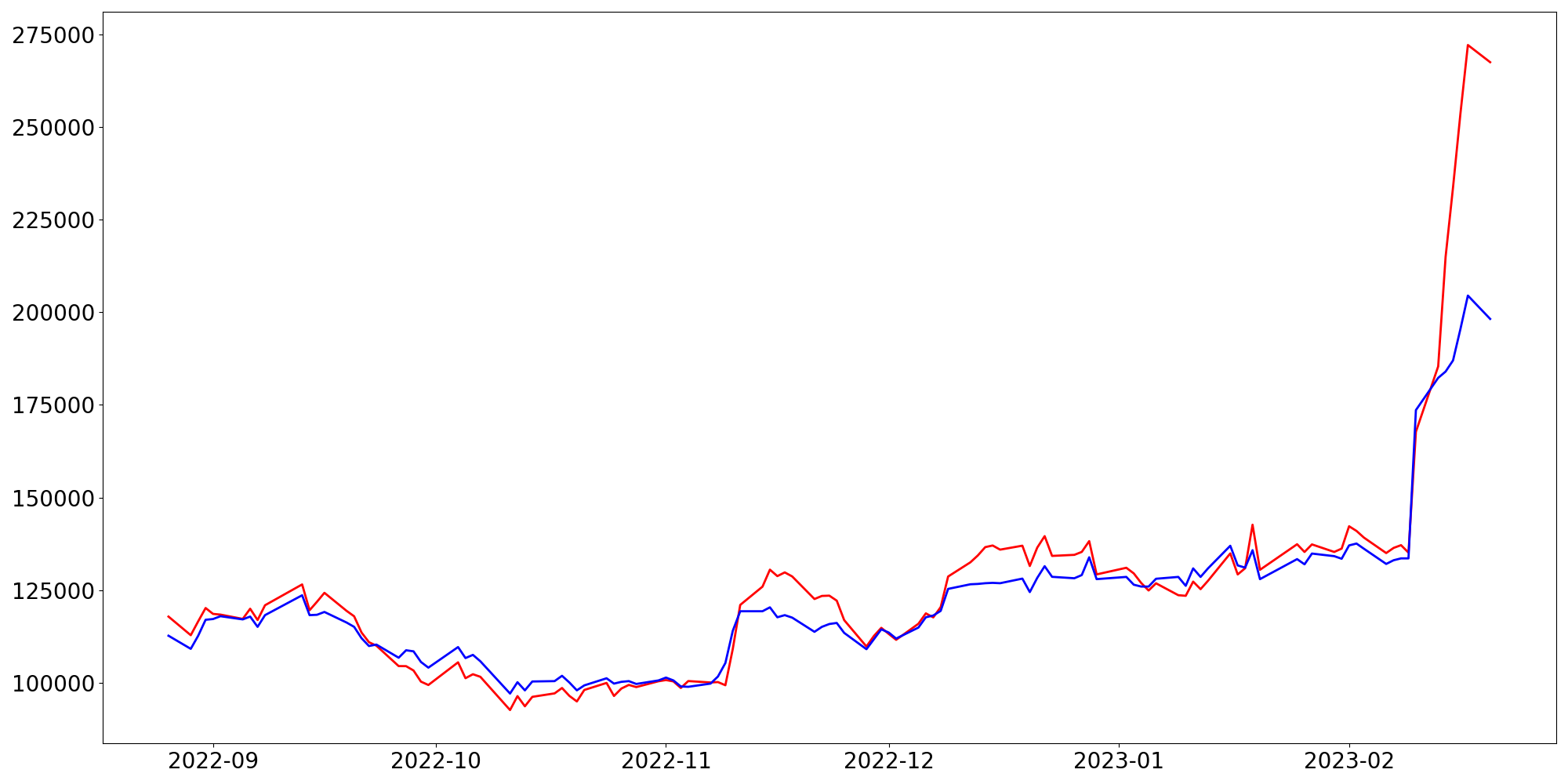 [ - : 실제값(종가) / - : 예측값(종가) ]