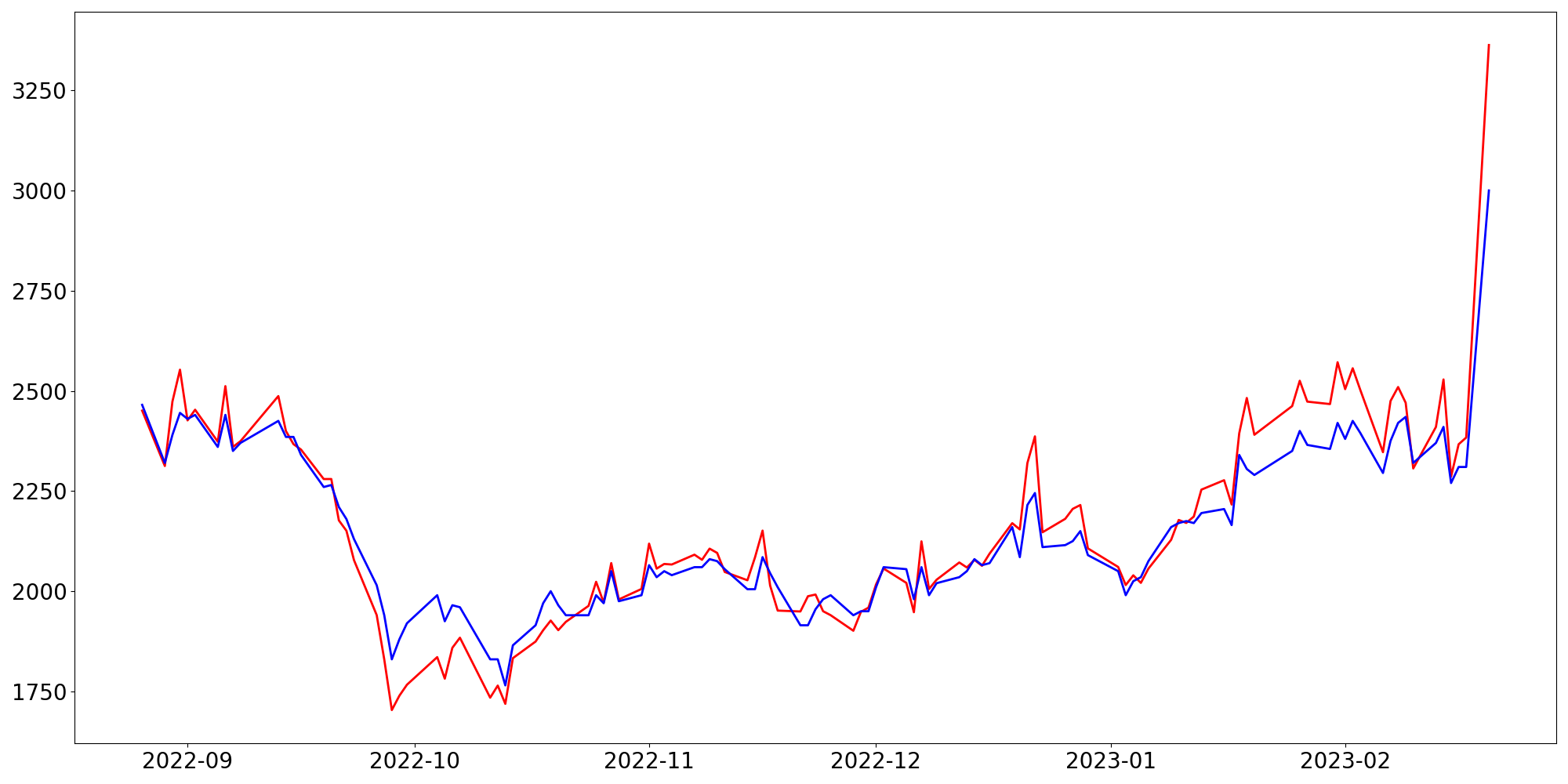 [ - : 실제값(종가) / - : 예측값(종가) ]