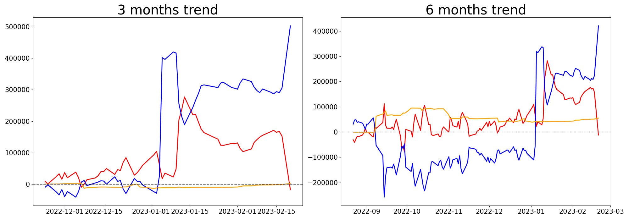 기관, 개인, 외국인으로 분류하여 투자주체별 일정기간동안의 누적적 매수/매도 현황을 분석한 내용입니다. 특정일의 투자자별 매매동향을 통해서 단기간의 시장충격여부를 판단할 수 있으며 장기적인 매매동향을 통해서 해당 종목의 장기 모멘텀을 판단해 볼 수 있습니다.