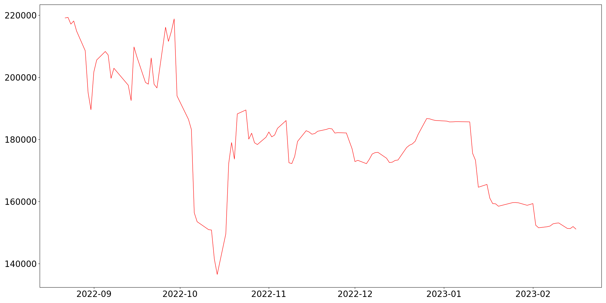 일별 공매도 거래량 추이를 그래프로 나타낸 것으로 공매도 거래량이 증가할 수록 단기적으로 가격 하락을 예측하는 시장참가자가 증거하는 것으로 판단해 볼 수 있습니다.