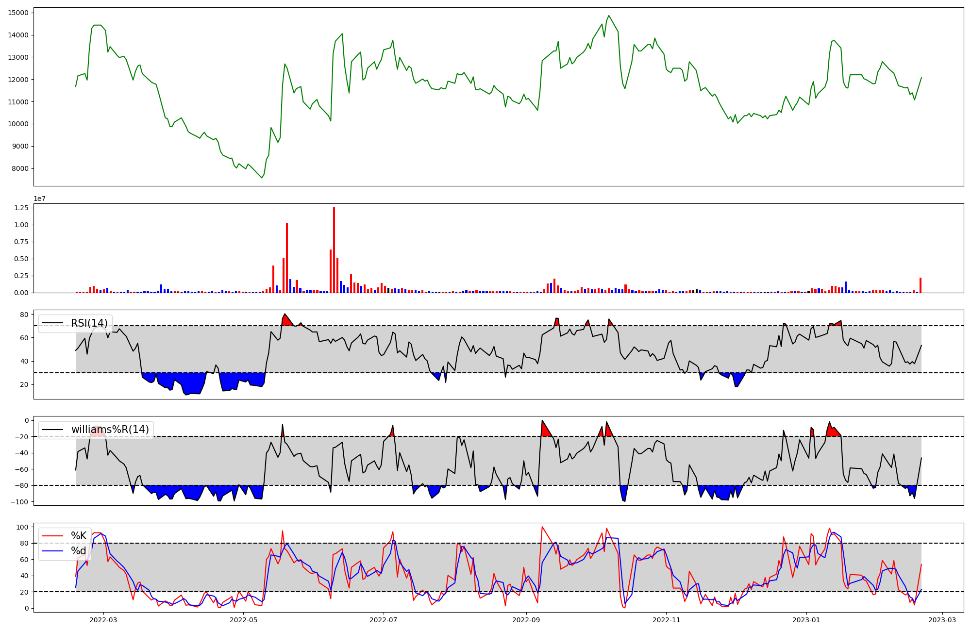 일별 기술적 지표(모멘텀 / 추세 / 시장강도 등)를 활용하여 향후 주가의 움직임을 회귀분석(Regression Analysis)을 통햬 예측해 본 결과입니다.
