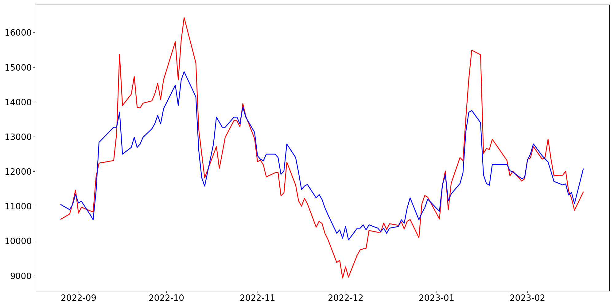 [ - : 실제값(종가) / - : 예측값(종가) ]