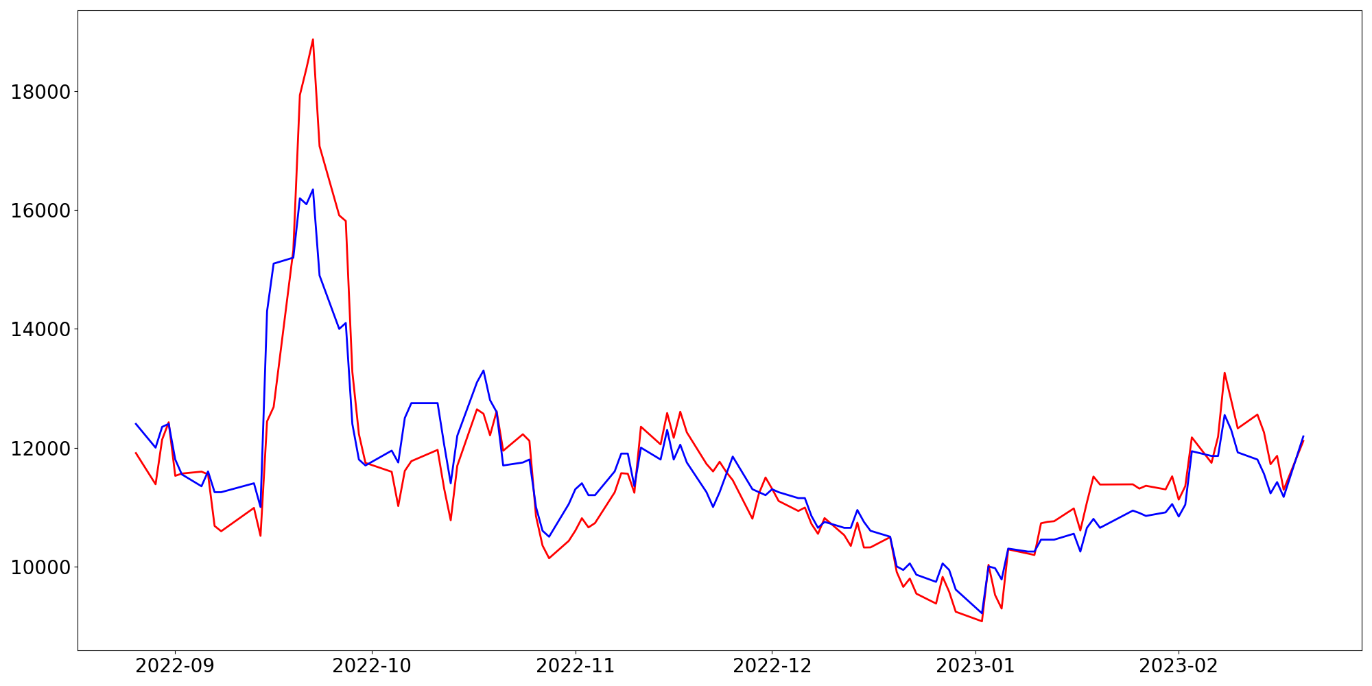 [ - : 실제값(종가) / - : 예측값(종가) ]