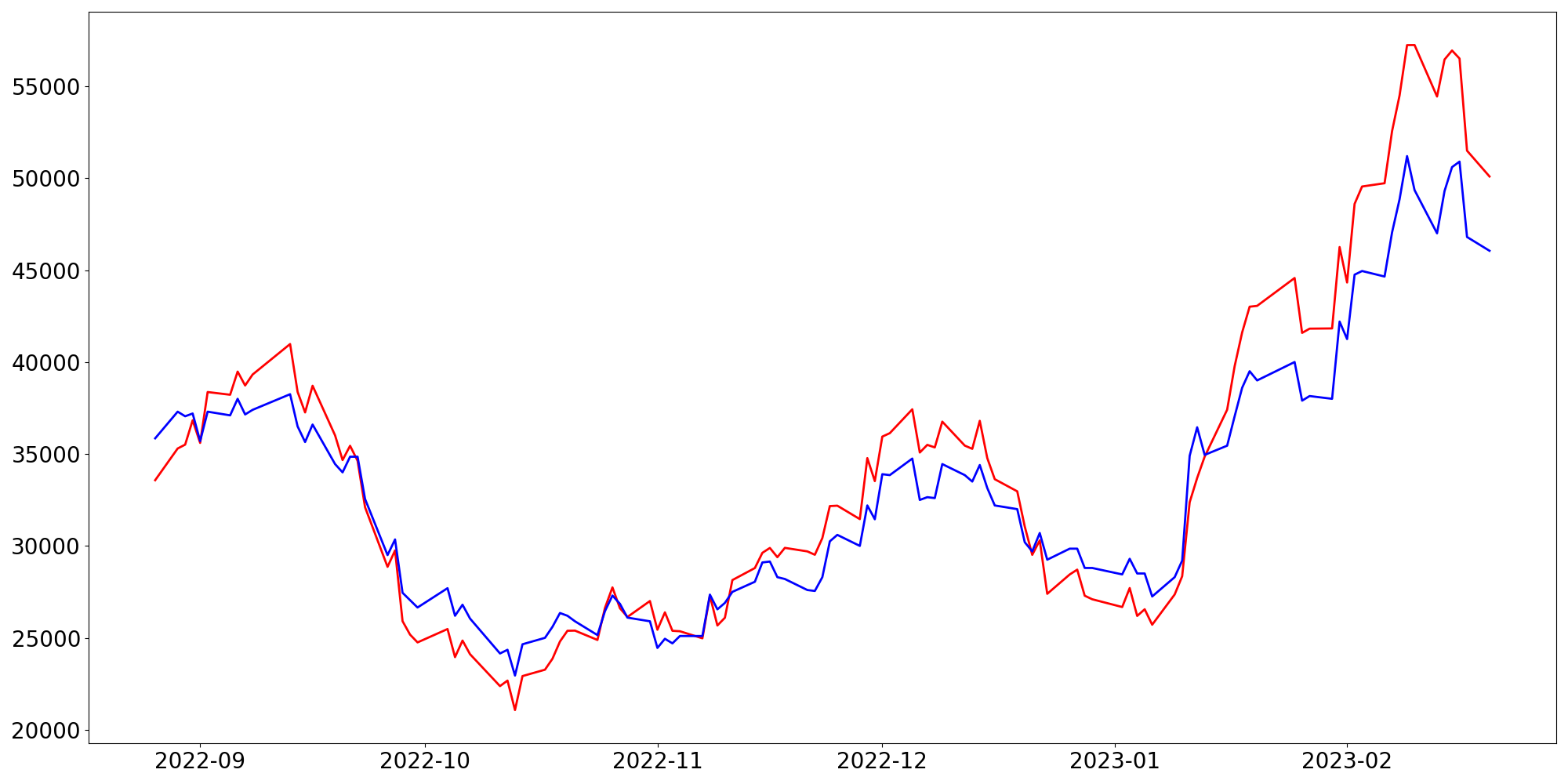 [ - : 실제값(종가) / - : 예측값(종가) ]