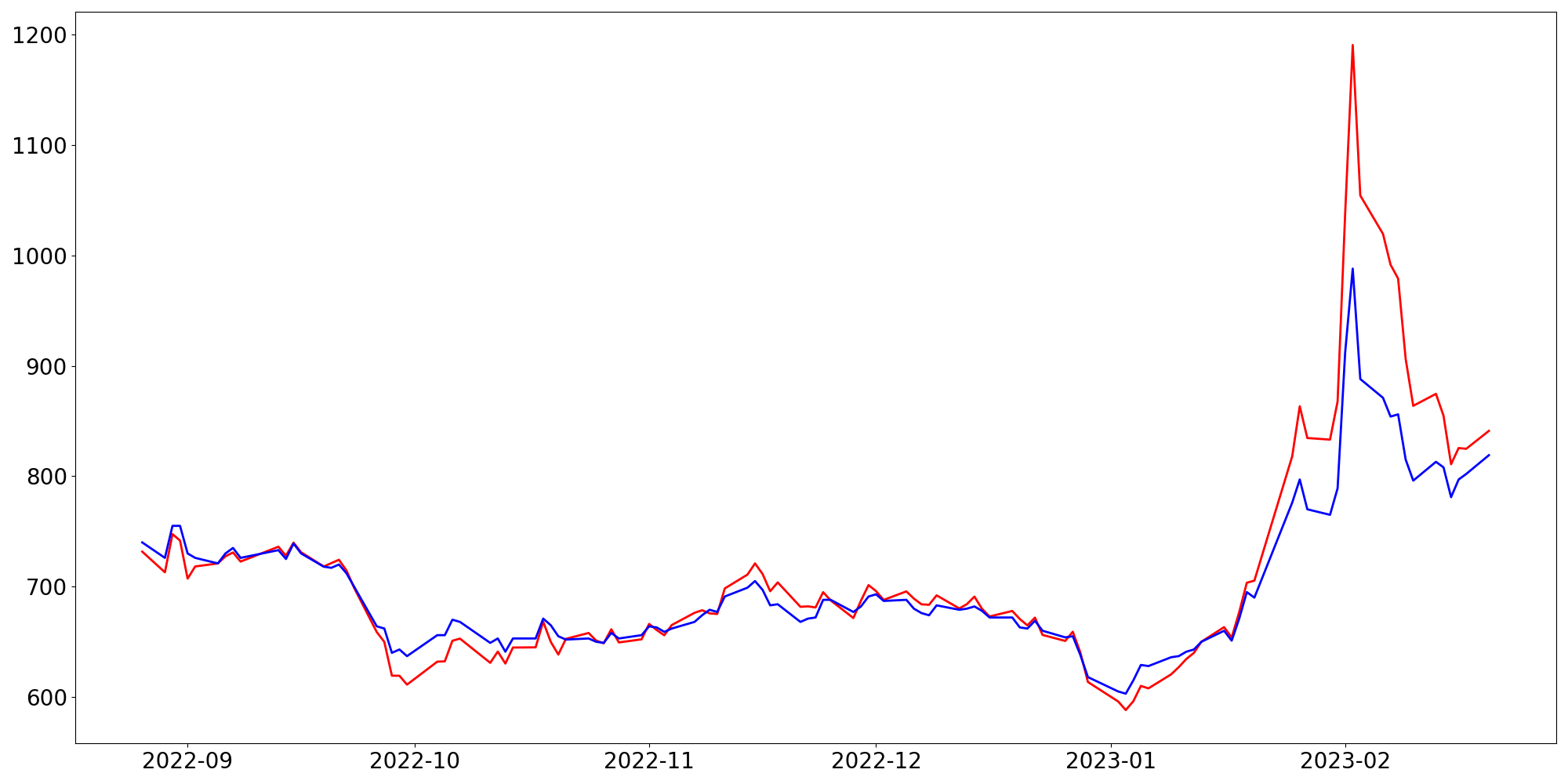 [ - : 실제값(종가) / - : 예측값(종가) ]