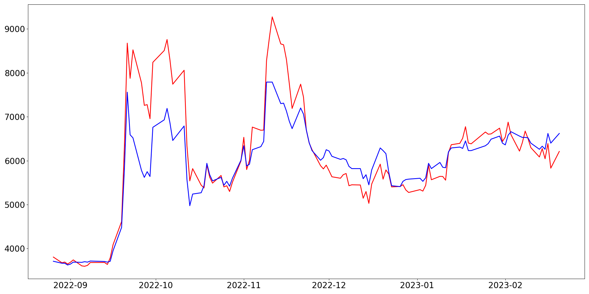 [ - : 실제값(종가) / - : 예측값(종가) ]