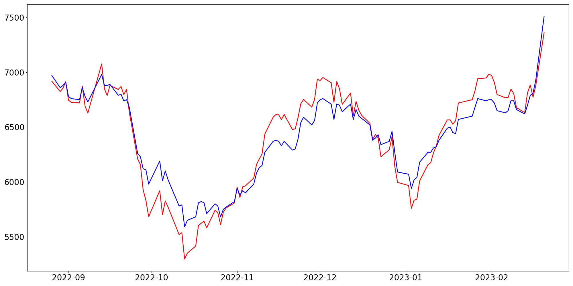 [ - : 실제값(종가) / - : 예측값(종가) ]