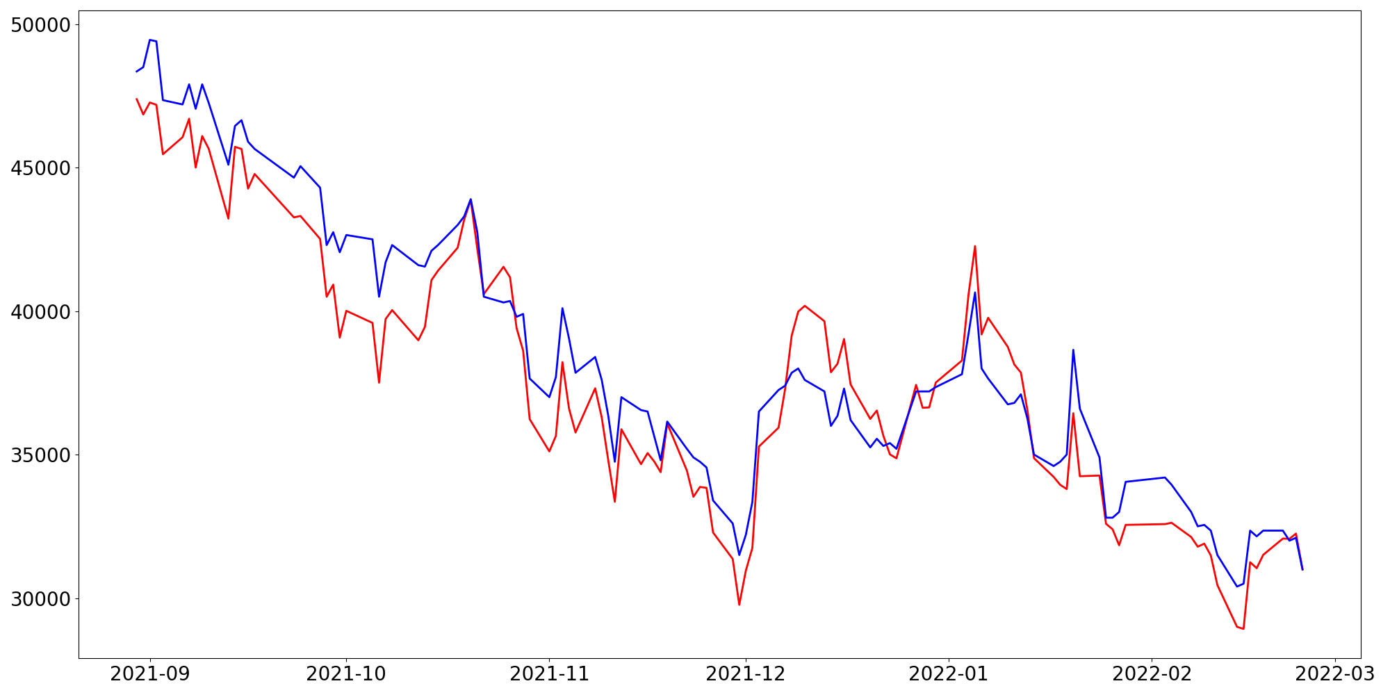[ - : 실제값(종가) / - : 예측값(종가) ]