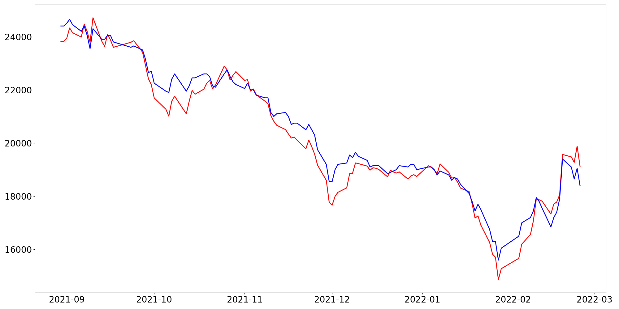 [ - : 실제값(종가) / - : 예측값(종가) ]