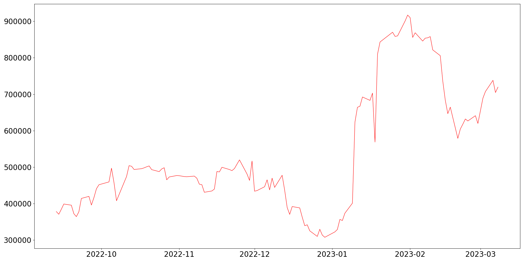 [ - : 실제값(종가) / - : 예측값(종가) ]