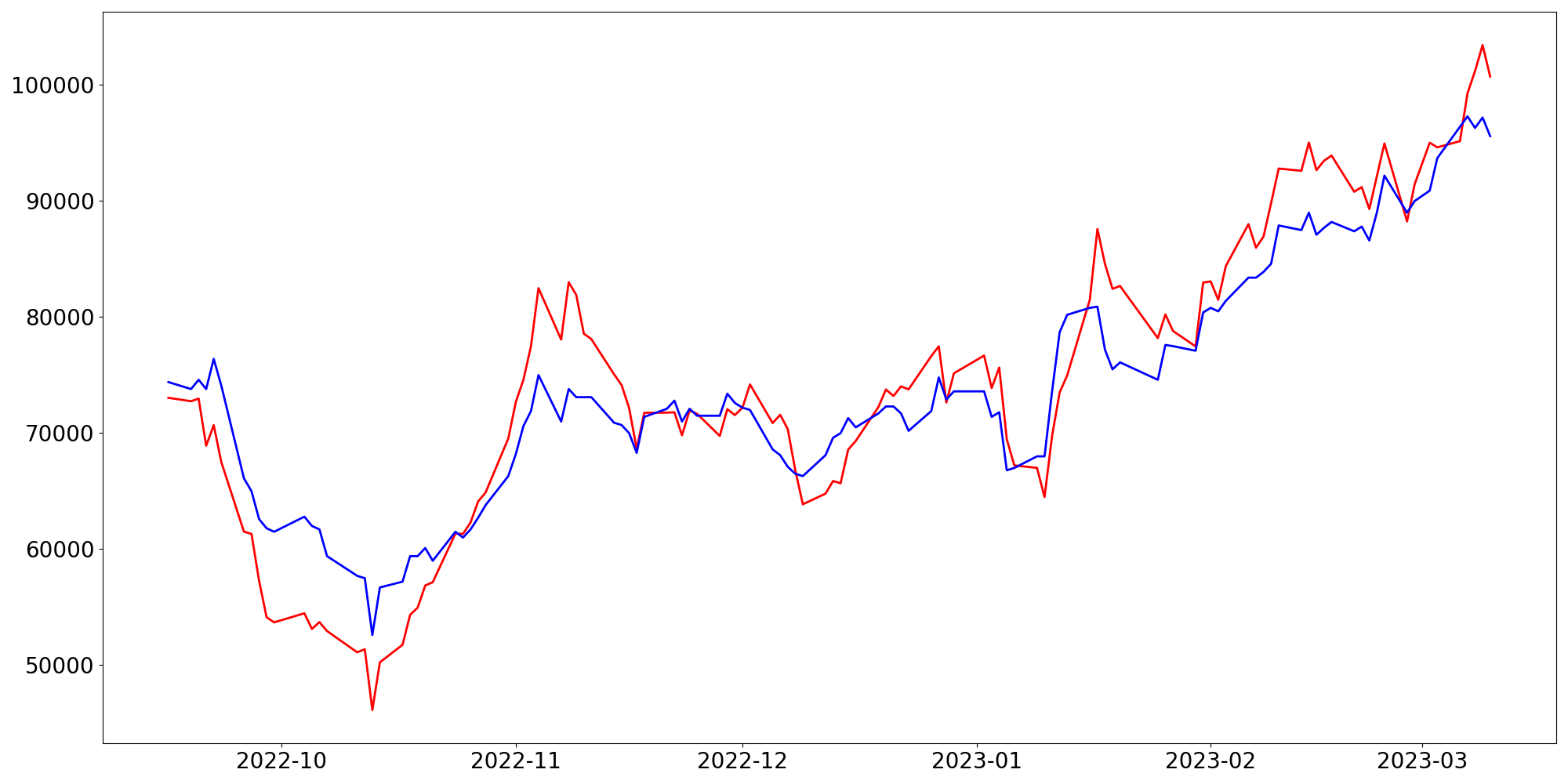 [ - : 실제값(종가) / - : 예측값(종가) ]