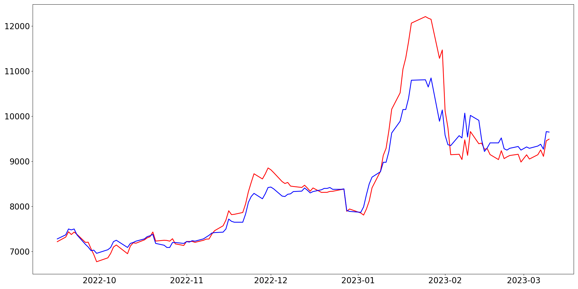 [ - : 실제값(종가) / - : 예측값(종가) ]