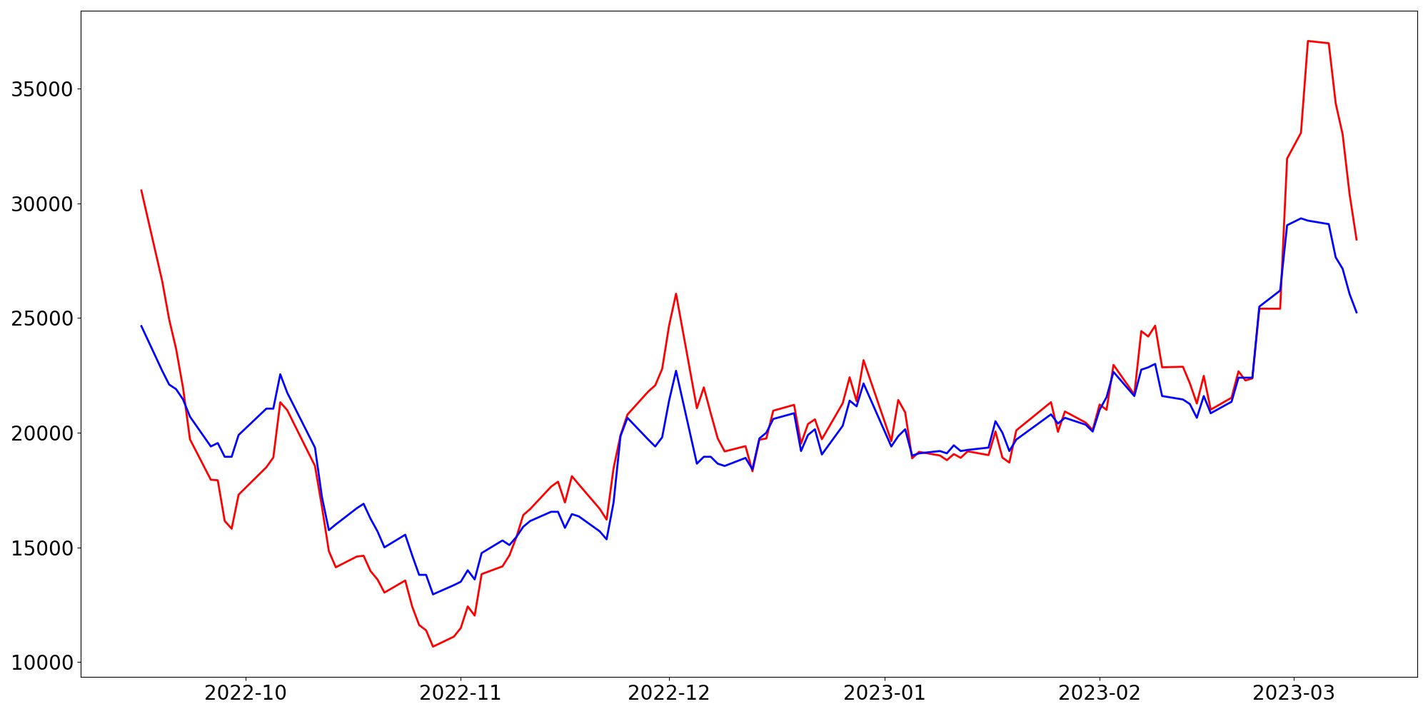 [ - : 실제값(종가) / - : 예측값(종가) ]