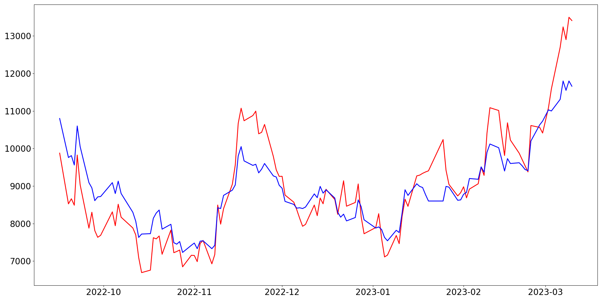 [ - : 실제값(종가) / - : 예측값(종가) ]