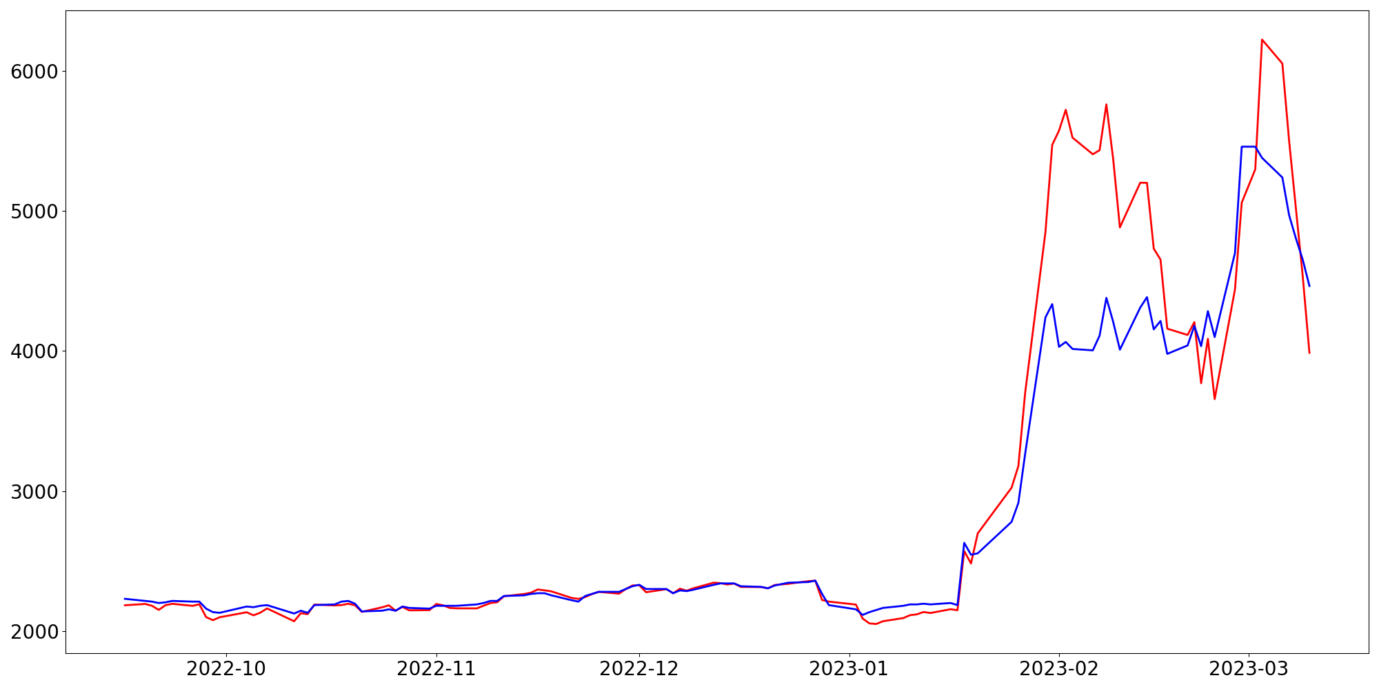 [ - : 실제값(종가) / - : 예측값(종가) ]