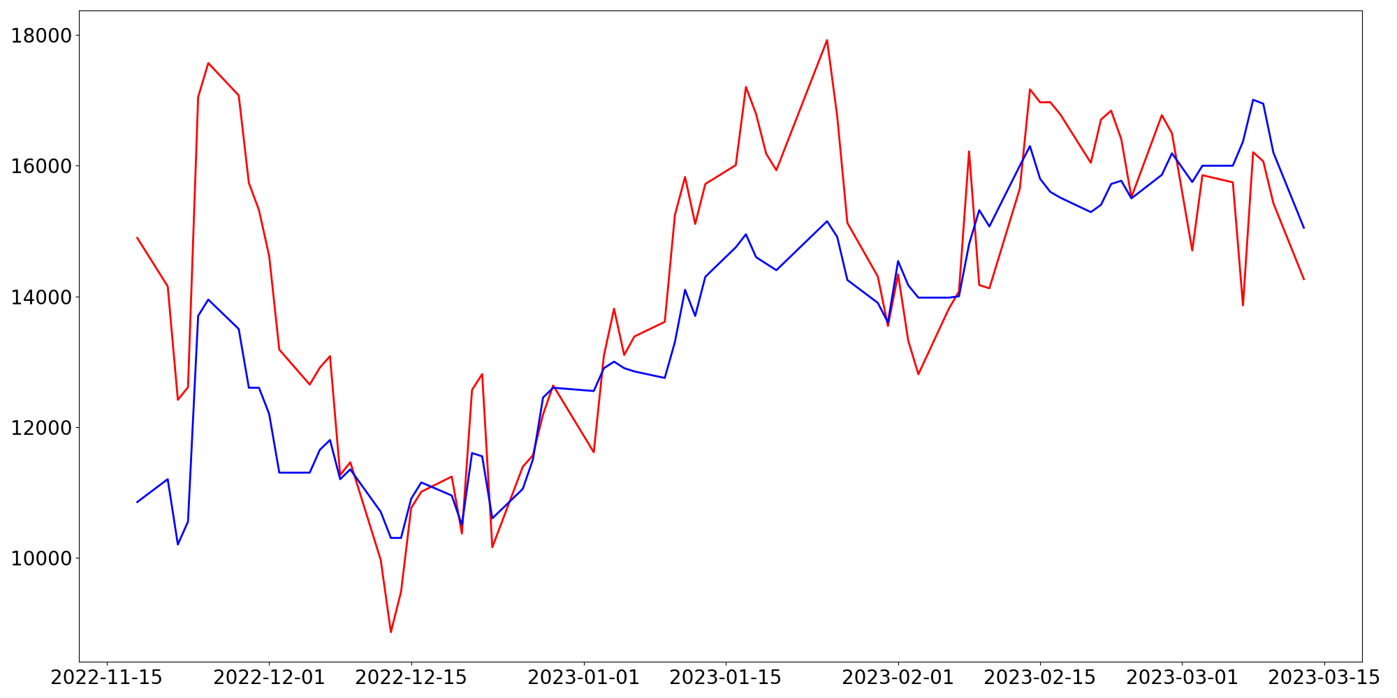 [ - : 실제값(종가) / - : 예측값(종가) ]