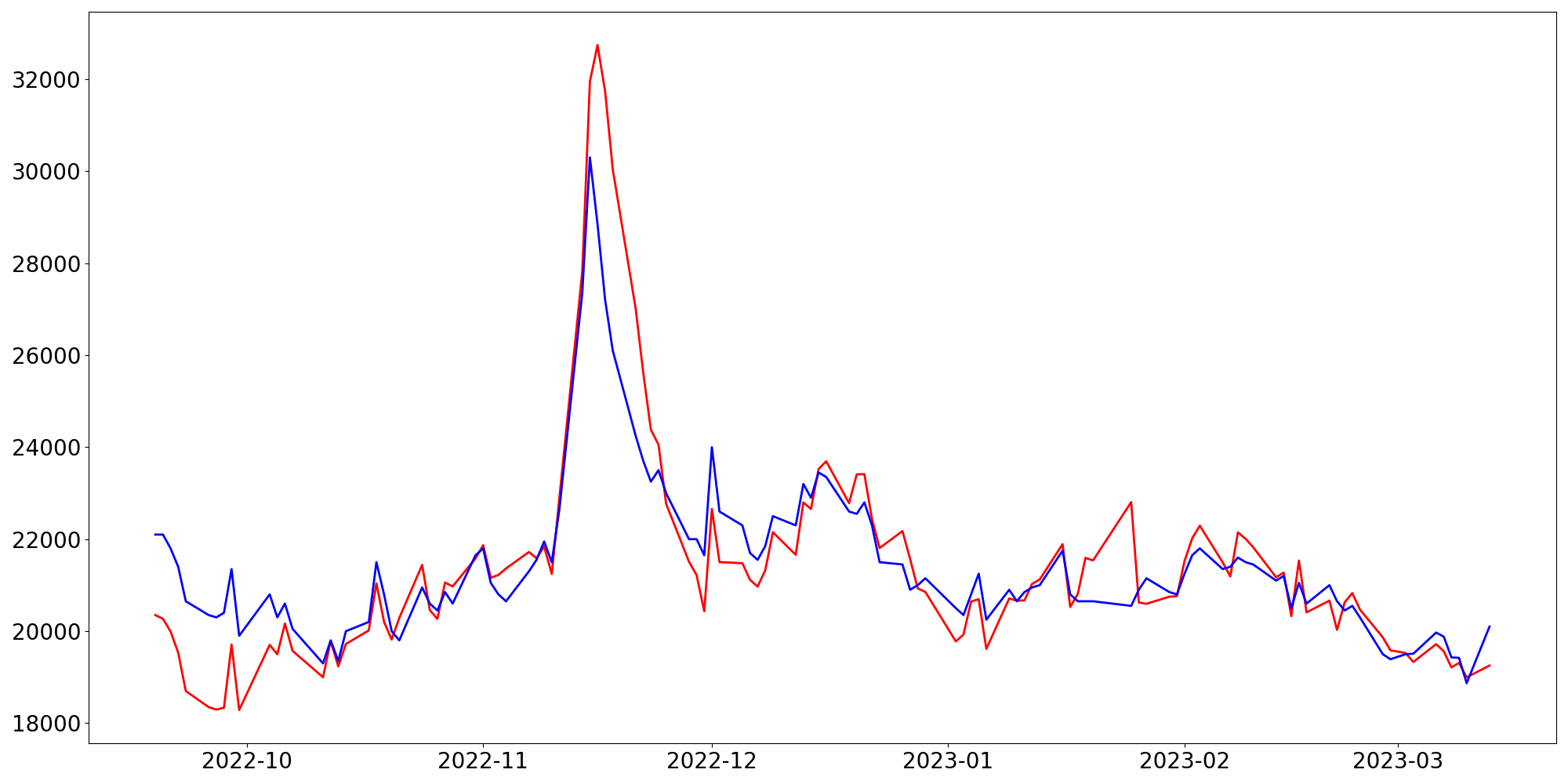 [ - : 실제값(종가) / - : 예측값(종가) ]