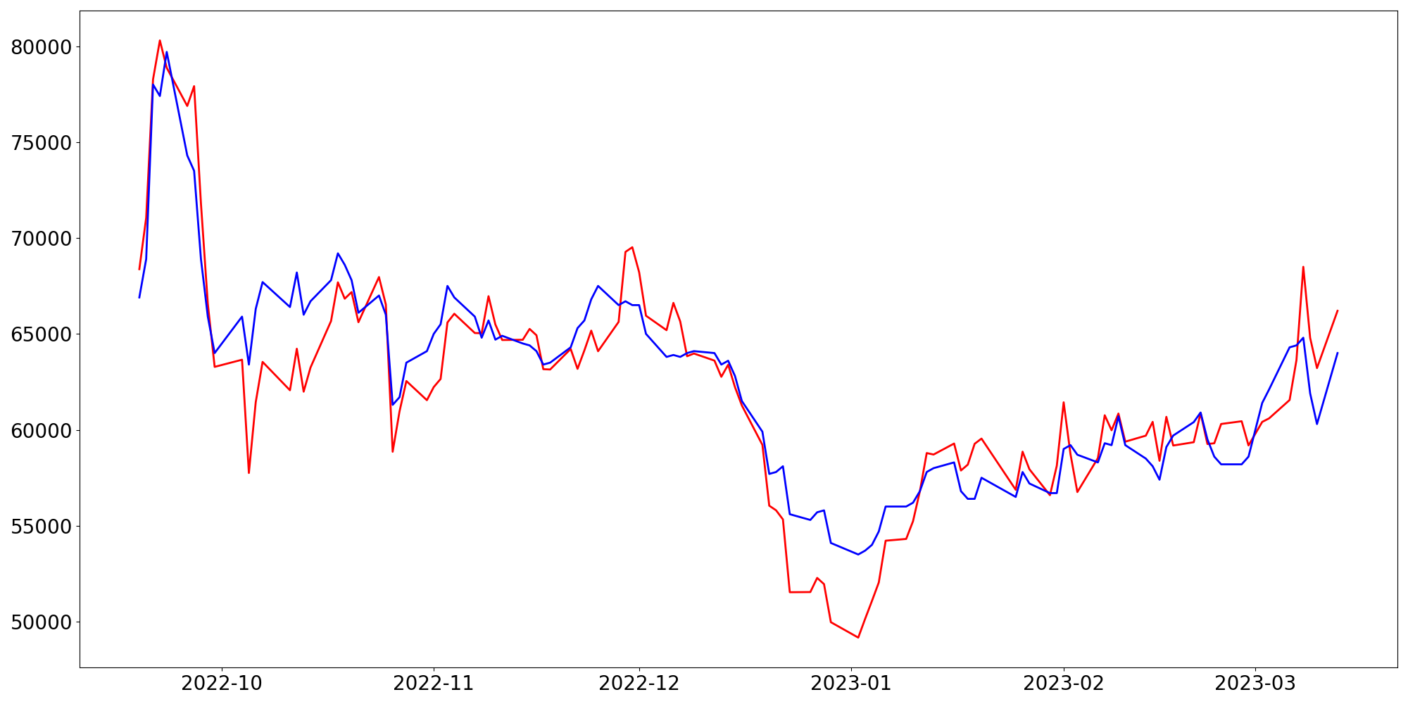 [ - : 실제값(종가) / - : 예측값(종가) ]