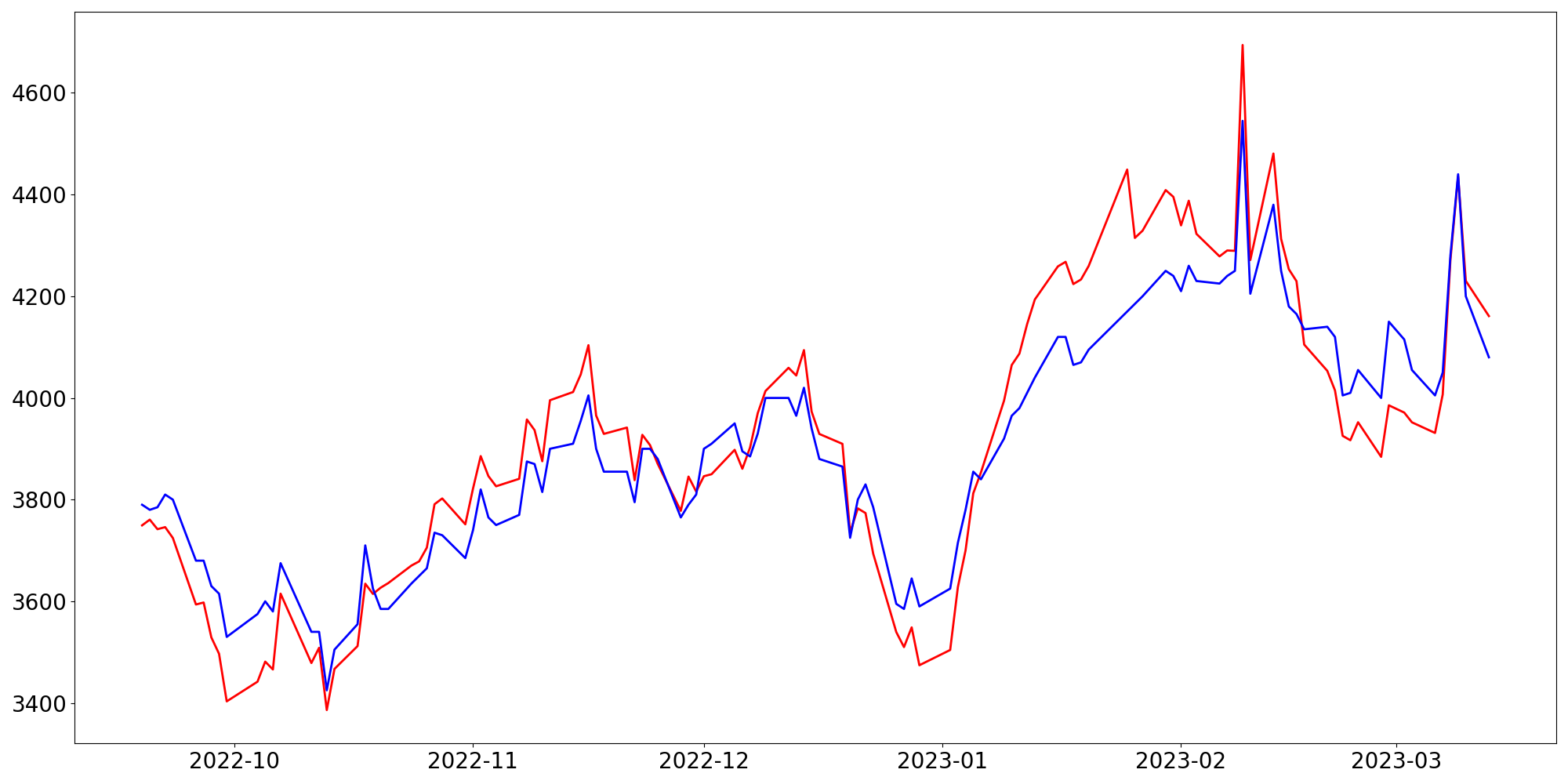 [ - : 실제값(종가) / - : 예측값(종가) ]