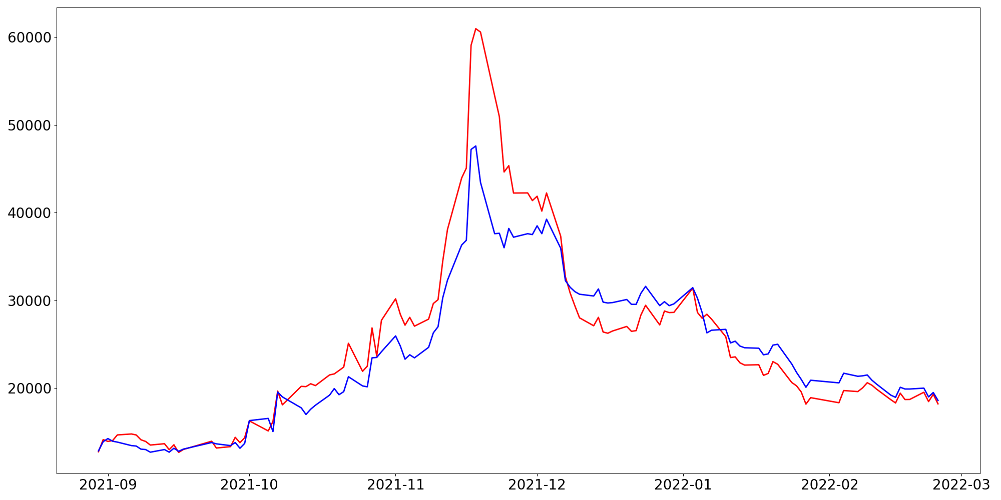 [ - : 실제값(종가) / - : 예측값(종가) ]