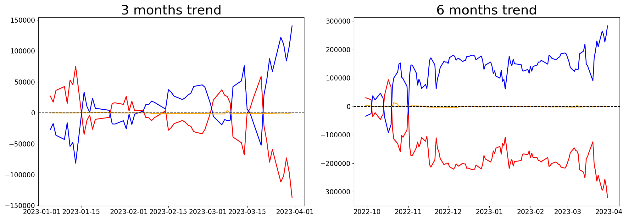 기관, 개인, 외국인으로 분류하여 투자주체별 일정기간동안의 누적적 매수/매도 현황을 분석한 내용입니다. 특정일의 투자자별 매매동향을 통해서 단기간의 시장충격여부를 판단할 수 있으며 장기적인 매매동향을 통해서 해당 종목의 장기 모멘텀을 판단해 볼 수 있습니다.
