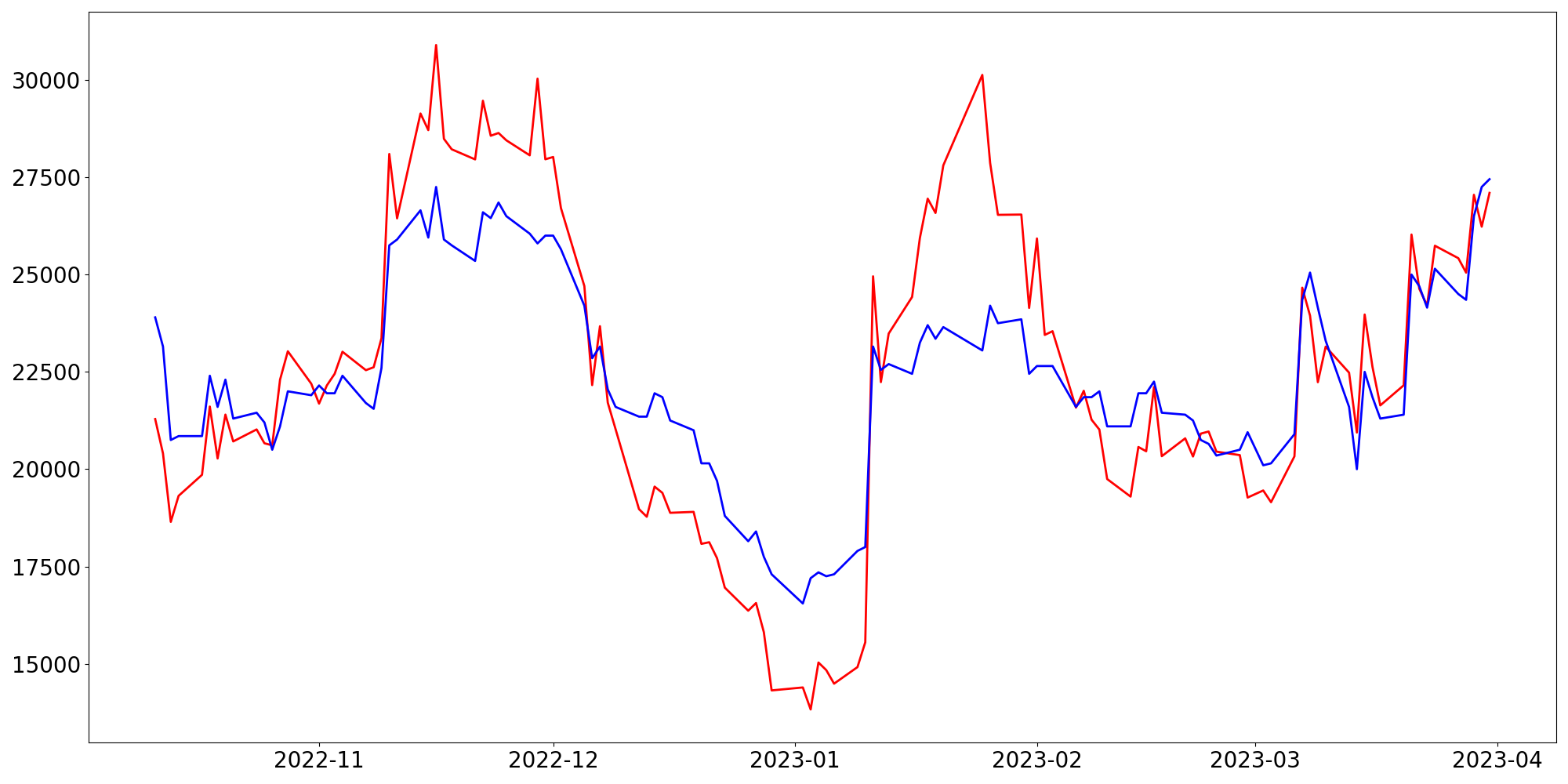 [ - : 실제값(종가) / - : 예측값(종가) ]