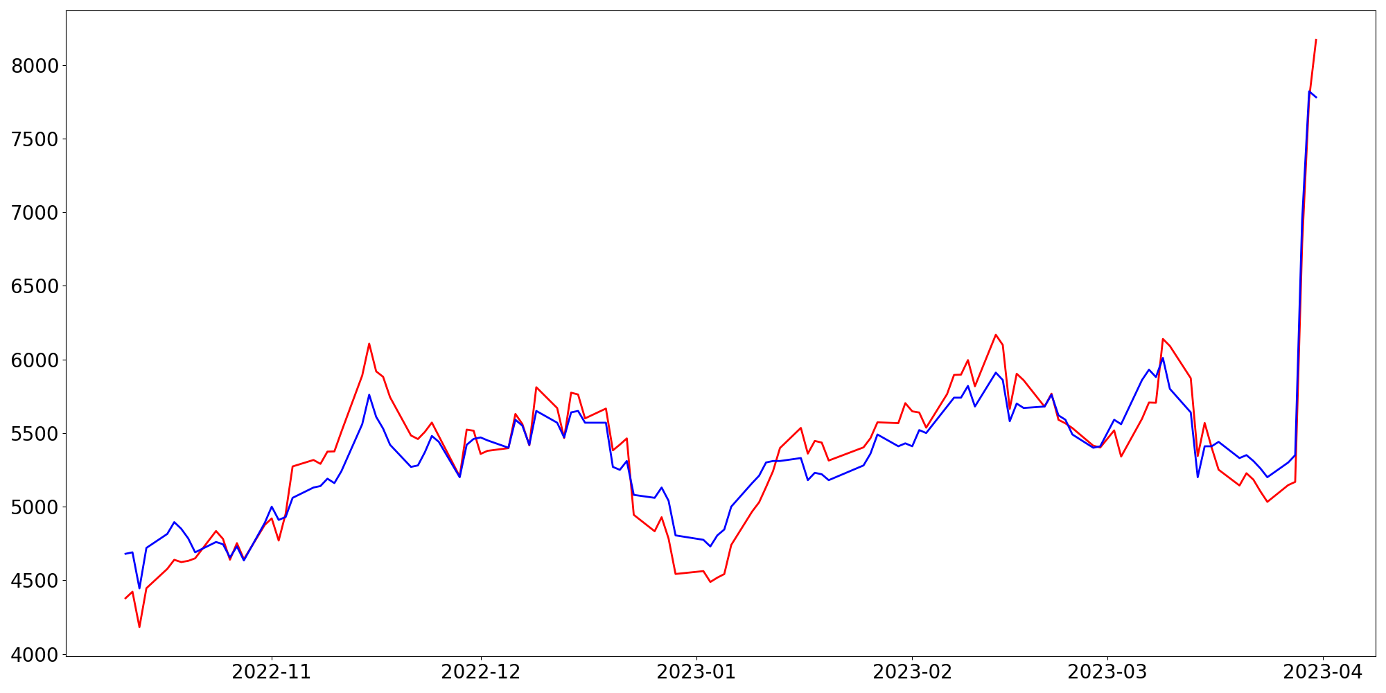 [ - : 실제값(종가) / - : 예측값(종가) ]