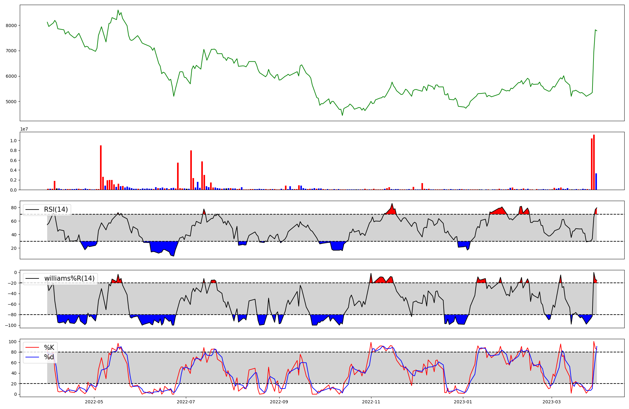 일별 기술적 지표(모멘텀 / 추세 / 시장강도 등)를 활용하여 향후 주가의 움직임을 회귀분석(Regression Analysis)을 통햬 예측해 본 결과입니다.