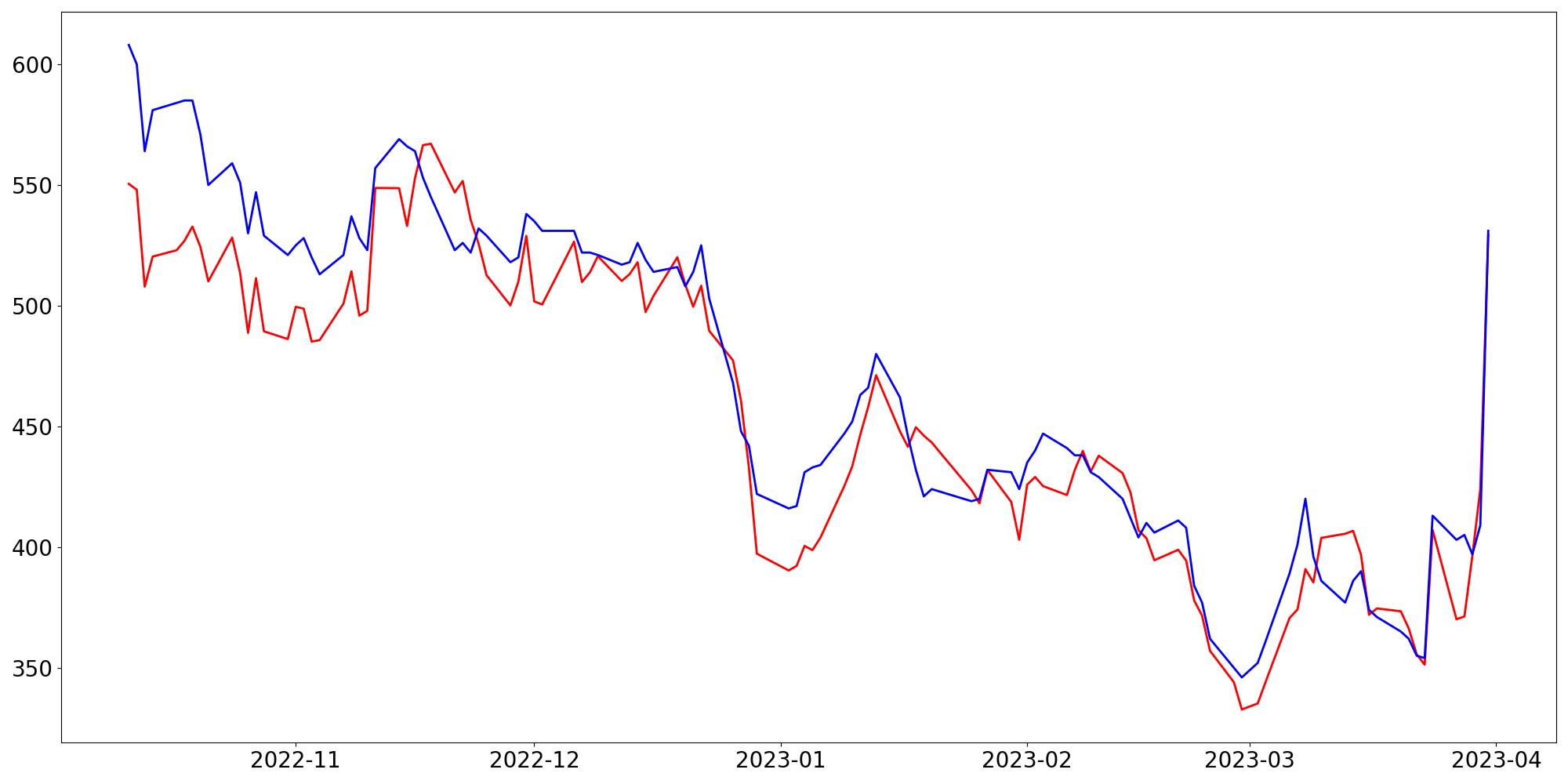 [ - : 실제값(종가) / - : 예측값(종가) ]