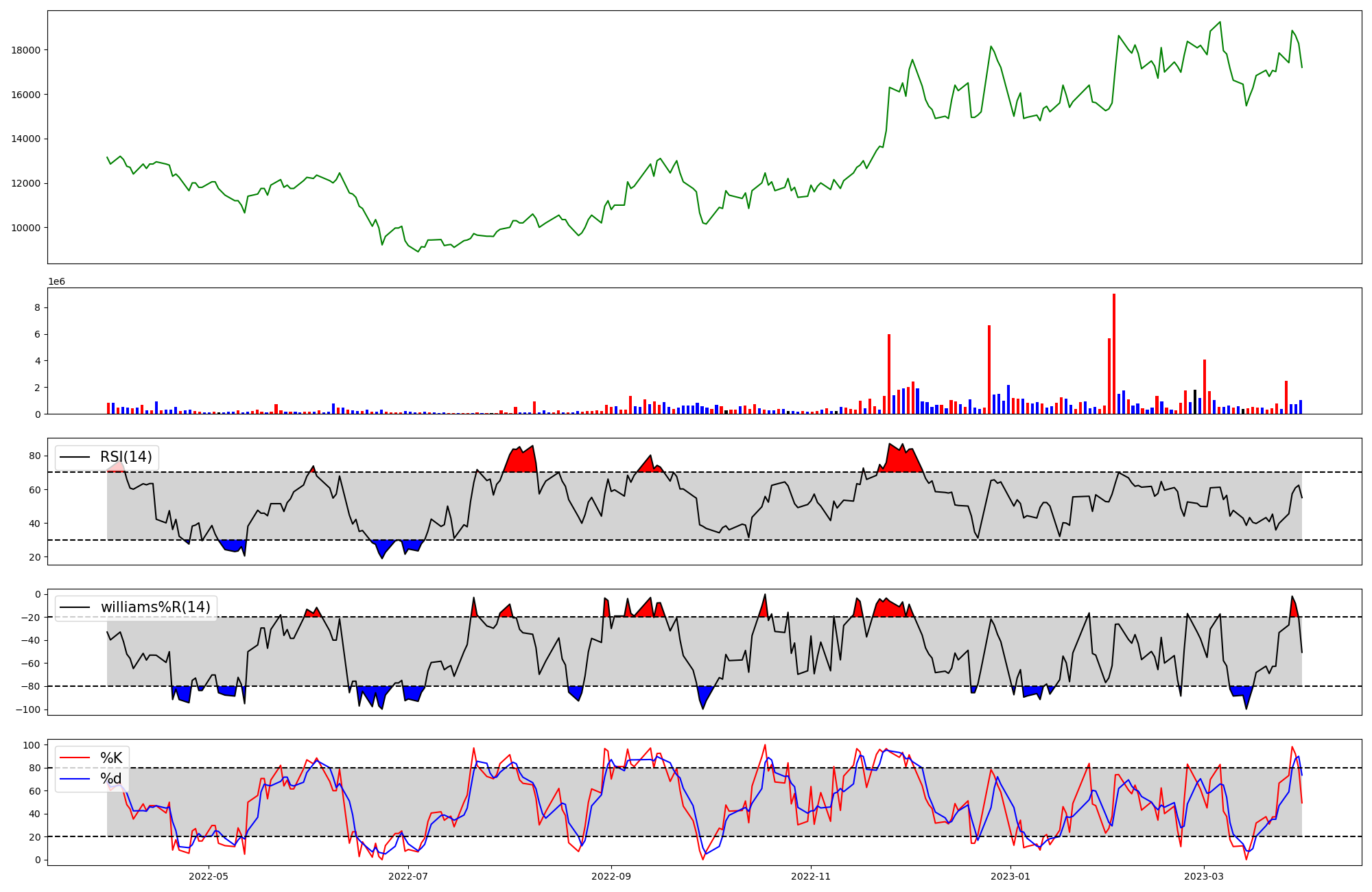 일별 기술적 지표(모멘텀 / 추세 / 시장강도 등)를 활용하여 향후 주가의 움직임을 회귀분석(Regression Analysis)을 통햬 예측해 본 결과입니다.
