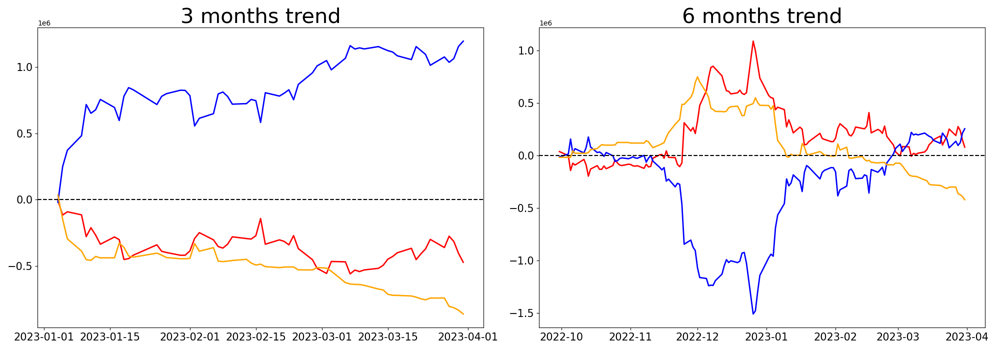 기관, 개인, 외국인으로 분류하여 투자주체별 일정기간동안의 누적적 매수/매도 현황을 분석한 내용입니다. 특정일의 투자자별 매매동향을 통해서 단기간의 시장충격여부를 판단할 수 있으며 장기적인 매매동향을 통해서 해당 종목의 장기 모멘텀을 판단해 볼 수 있습니다.